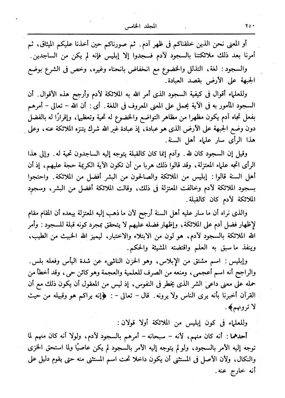 وقيل إن السجود كان لله. وآدم إنما كان كالقبلة يتوجه إليه الساجدون تحية له. وإلى هذا الرأى اتجه علماء المعتزلة، وقد قالوا ذلك هربا من أن تكون الآية الكريمة حجة عليهم، إذ أن أهل السنة قالوا: إبليس من الملائكة والصالحون من البشر أفضل من الملائكة. واحتجوا بسجود الملائكة لآدم وخالفت المعتزلة في ذلك، وقالت الملائكة أفضل من البشر، وسجود الملائكة لآدم كان كالقبلة.