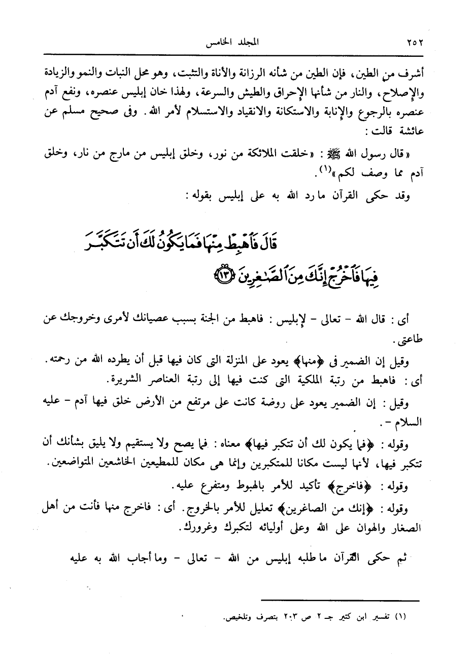 أشرف من الطين، فإن الطين من شأنه الرزانة والأناة والتثبت، وهو محل النبات والنمو والزيادة والإصلاح، والنار من شأنها الإحراق والطيش والسرعة، ولهذا خان إبليس عنصره، ونفع آدم عنصره بالرجوع والإنابة والاستكانة والانقياد والاستسلام لأمر الله. وفي صحيح مسلم عن عائشة قالت: