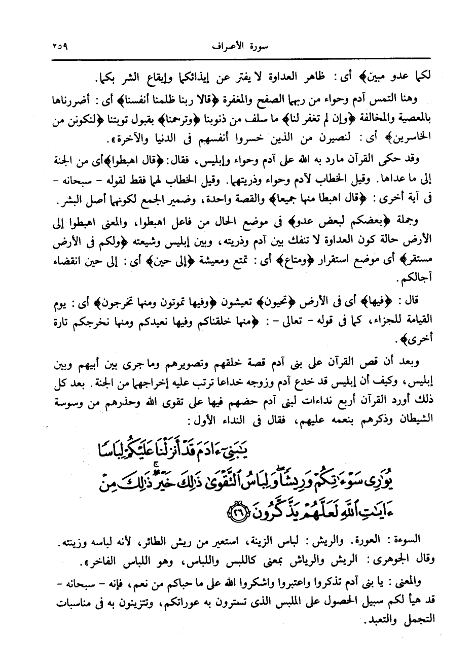 يا بَنِي آدَمَ قَدْ أَنْزَلْنا عَلَيْكُمْ لِباساً يُوارِي سَوْآتِكُمْ وَرِيشاً وَلِباسُ التَّقْوى ذلِكَ خَيْرٌ ذلِكَ مِنْ آياتِ اللَّهِ لَعَلَّهُمْ يَذَّكَّرُونَ (26)