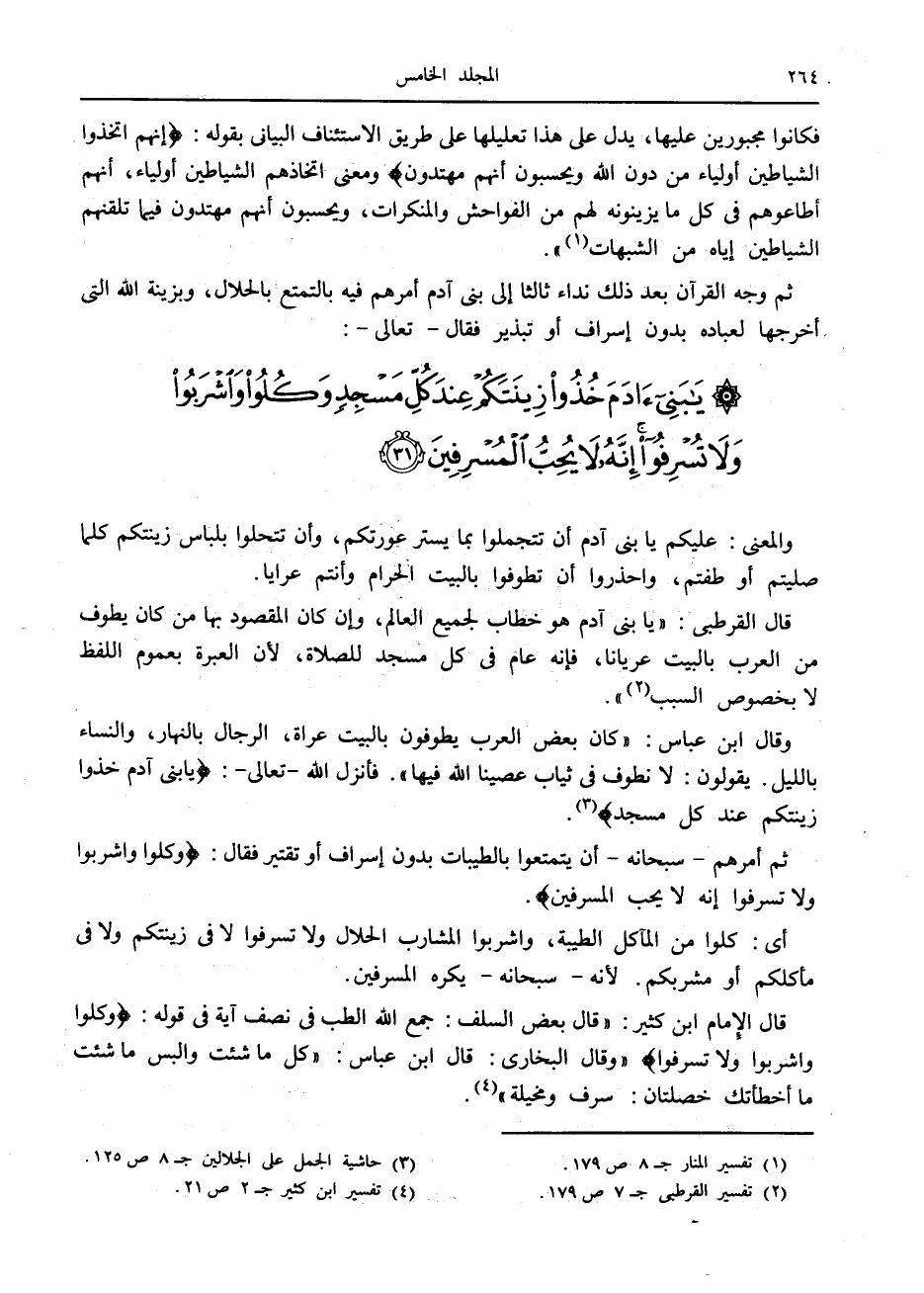 يا بَنِي آدَمَ خُذُوا زِينَتَكُمْ عِنْدَ كُلِّ مَسْجِدٍ وَكُلُوا وَاشْرَبُوا وَلا تُسْرِفُوا إِنَّهُ لا يُحِبُّ الْمُسْرِفِينَ (31)