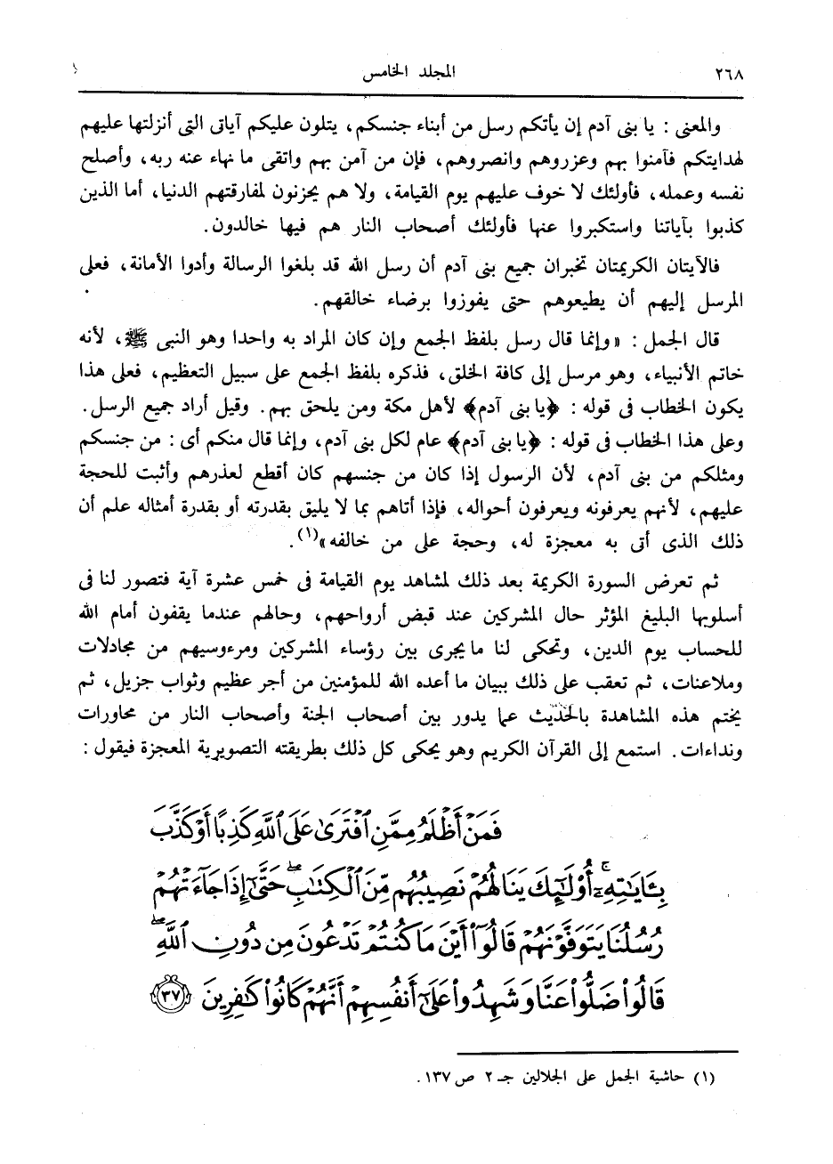 وعلى هذا الخطاب في قوله: يا بَنِي آدَمَ عام لكل بنى آدم، وإنما قال منكم أى: من جنسكم ومثلكم من بنى آدم، لأن الرسول إذا كان من جنسهم كان أقطع لعذرهم وأثبت للحجة عليهم، لأنهم يعرفونه ويعرفون أحواله، فإذا أتاهم بما لا يليق بقدرته أو بقدرة أمثاله علم أن ذلك الذي أتى به معجزة له، وحجة على من خالفه» «1» .