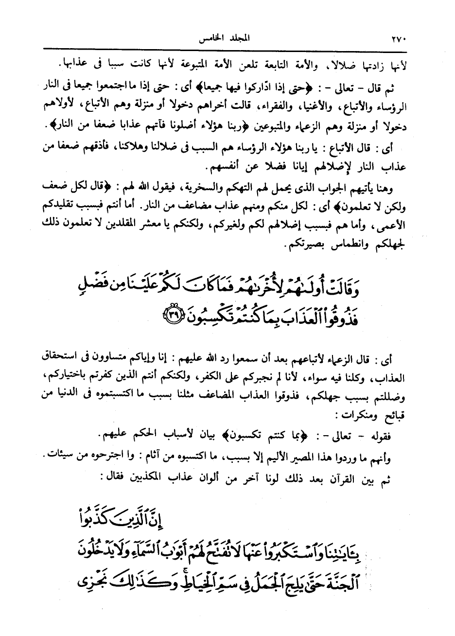 وَقالَتْ أُولاهُمْ لِأُخْراهُمْ فَما كانَ لَكُمْ عَلَيْنا مِنْ فَضْلٍ فَذُوقُوا الْعَذابَ بِما كُنْتُمْ تَكْسِبُونَ (39)