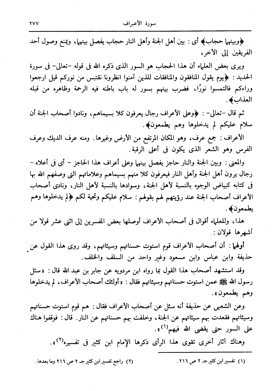 أولهما: أن أصحاب الأعراف قوم استوت حسناتهم وسيئاتهم، وقد روى هذا القول عن حذيفة وابن عباس وابن مسعود وغير واحد من السلف والخلف.