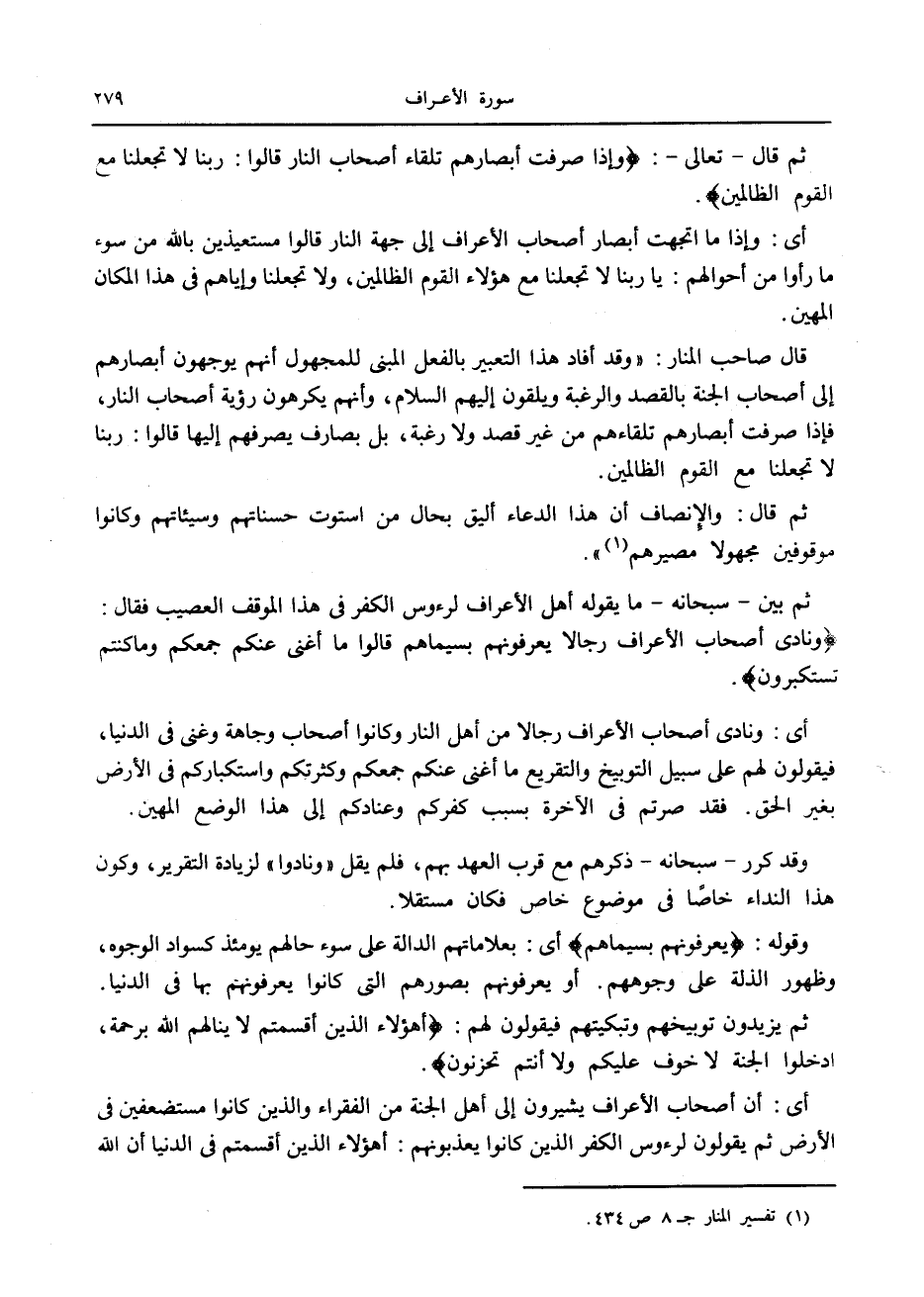 قال صاحب المنار: «وقد أفاد هذا التعبير بالفعل المبنى للمجهول أنهم يوجهون أبصارهم إلى أصحاب الجنة بالقصد والرغبة ويلقون إليهم السلام، وأنهم يكرهون رؤية أصحاب النار، فإذا صرفت أبصارهم تلقاءهم من غير قصد ولا رغبة، بل بصارف يصرفهم إليها قالوا: ربنا لا تجعلنا مع القوم الظالمين.