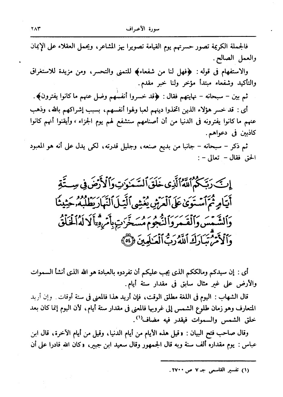 إِنَّ رَبَّكُمُ اللَّهُ الَّذِي خَلَقَ السَّماواتِ وَالْأَرْضَ فِي سِتَّةِ أَيَّامٍ ثُمَّ اسْتَوى عَلَى الْعَرْشِ يُغْشِي اللَّيْلَ النَّهارَ يَطْلُبُهُ حَثِيثاً وَالشَّمْسَ وَالْقَمَرَ وَالنُّجُومَ مُسَخَّراتٍ بِأَمْرِهِ أَلا لَهُ الْخَلْقُ وَالْأَمْرُ تَبارَكَ اللَّهُ رَبُّ الْعالَمِينَ (54)