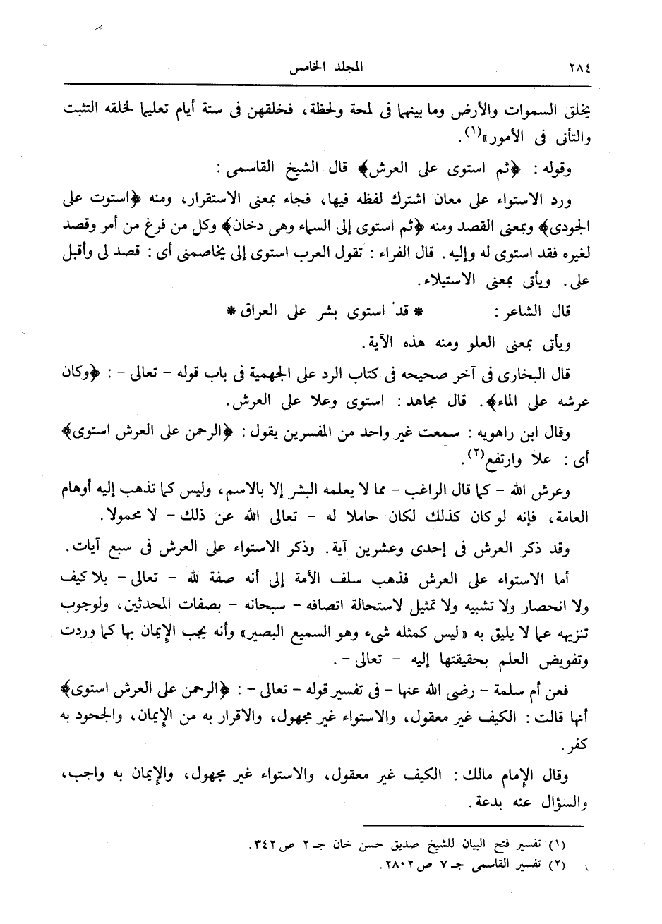 وقوله: ثُمَّ اسْتَوى عَلَى الْعَرْشِ قال الشيخ القاسمى: