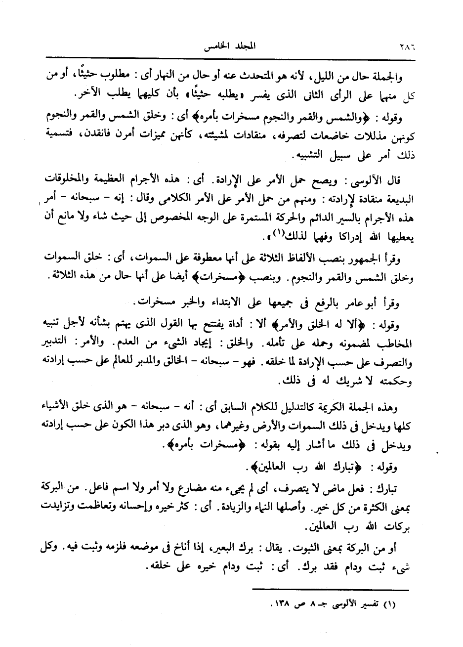 قال الآلوسى: ويصح حمل الأمر على الإرادة. أى: هذه الأجرام العظيمة والمخلوقات البديعة منقادة لإرادته: ومنهم من حمل الأمر على الأمر الكلامى وقال: إنه- سبحانه- أمر هذه الأجرام بالسير الدائم والحركة المستمرة على الوجه المخصوص إلى حيث شاء ولا مانع أن يعطيها الله إدراكا وفهما لذلك «1» » .