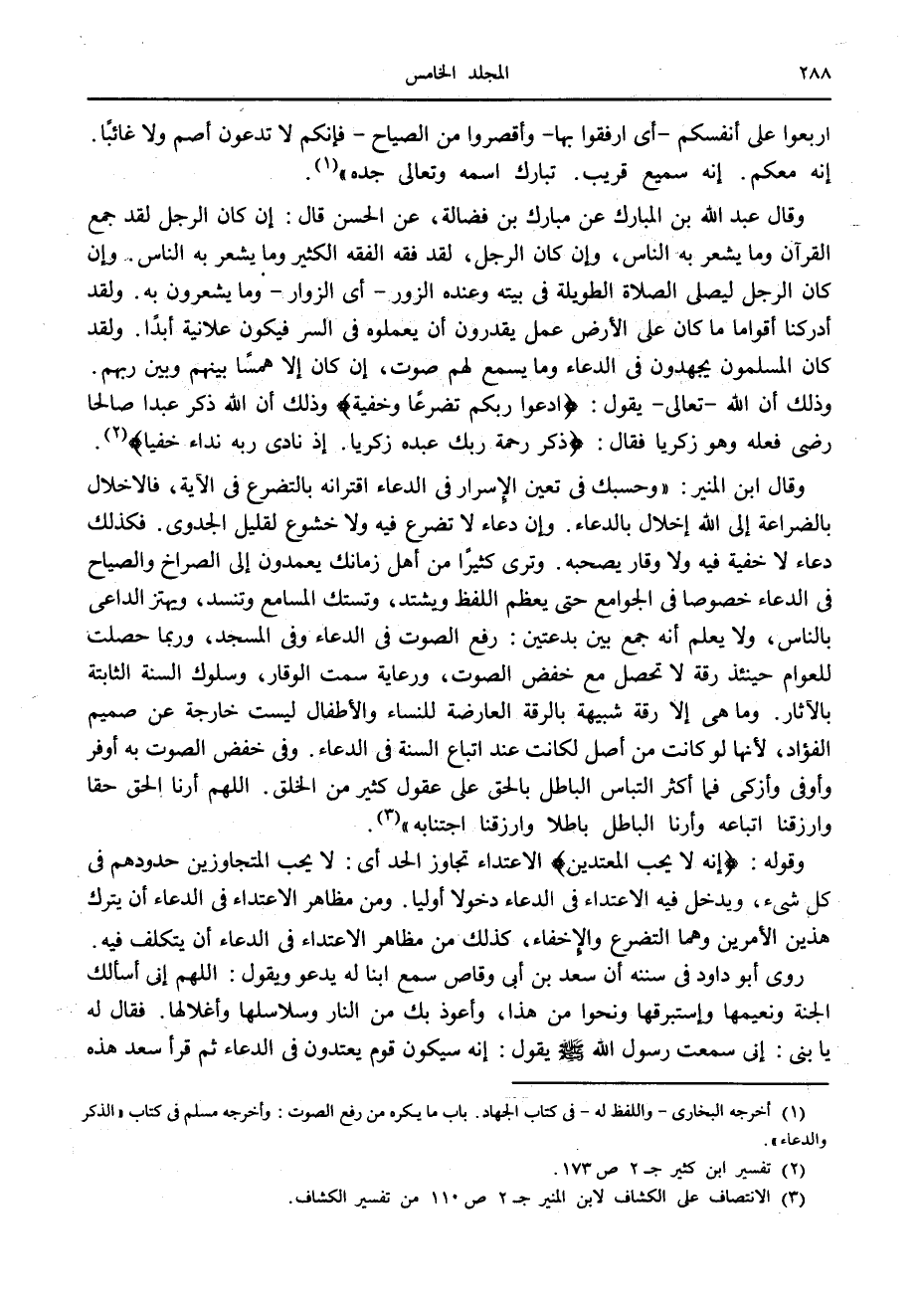 وقال ابن المنير: «وحسبك في تعين الإسرار في الدعاء اقترانه بالتضرع في الآية، فالاخلال بالضراعة إلى الله إخلال بالدعاء. وإن دعاء لا تضرع فيه ولا خشوع لقليل الجدوى. فكذلك دعاء لا خفية فيه ولا وقار يصحبه. وترى كثيرا من أهل زمانك يعمدون إلى الصراخ والصياح في الدعاء خصوصا في الجوامع حتى يعظم اللفظ ويشتد، وتستك المسامع وتنسد، ويهتز الداعي بالناس، ولا يعلم أنه جمع بين بدعتين: رفع الصوت في الدعاء وفي المسجد، وربما حصلت للعوام حينئذ رقة لا تحصل مع خفض الصوت، ورعاية سمت الوقار، وسلوك السنة الثابتة بالآثار. وما هي إلا رقة شبيهة بالرقة العارضة للنساء والأطفال ليست خارجة عن صميم الفؤاد، لأنها لو كانت من أصل لكانت عند اتباع السنة في الدعاء. وفي خفض الصوت به أوفر وأوفى وأزكى فما أكثر التباس الباطل بالحق على عقول كثير من الخلق. اللهم أرنا الحق حقا وارزقنا اتباعه وأرنا الباطل باطلا وارزقنا اجتنابه» «3» .