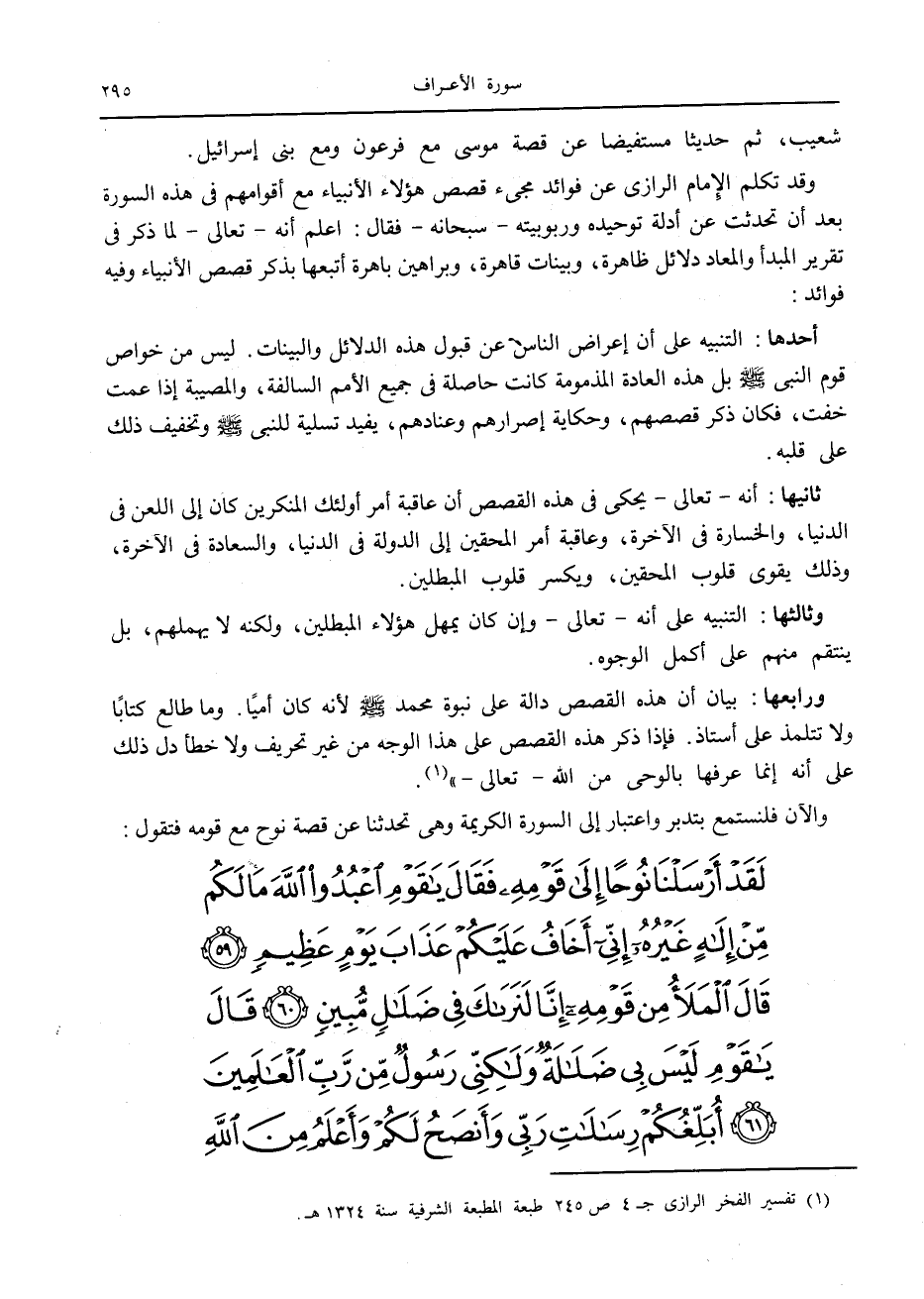 وقد تكلم الإمام الرازي عن فوائد مجيء قصص هؤلاء الأنبياء مع أقوامهم في هذه السورة بعد أن تحدثت عن أدلة توحيده وربوبيته- سبحانه- فقال: اعلم أنه- تعالى- لما ذكر في تقرير المبدأ والمعاد دلائل ظاهرة، وبينات قاهرة، وبراهين باهرة أتبعها بذكر قصص الأنبياء وفيه فوائد: