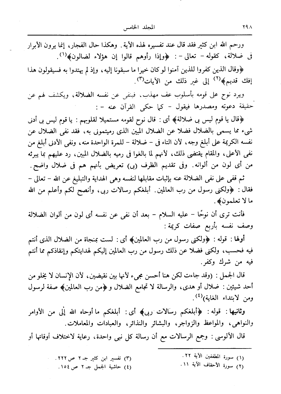 فأنت ترى أن نوحا- عليه السلام- بعد أن نفى عن نفسه أى لون من ألوان الضلالة وصف نفسه بأربع صفات كريمة: