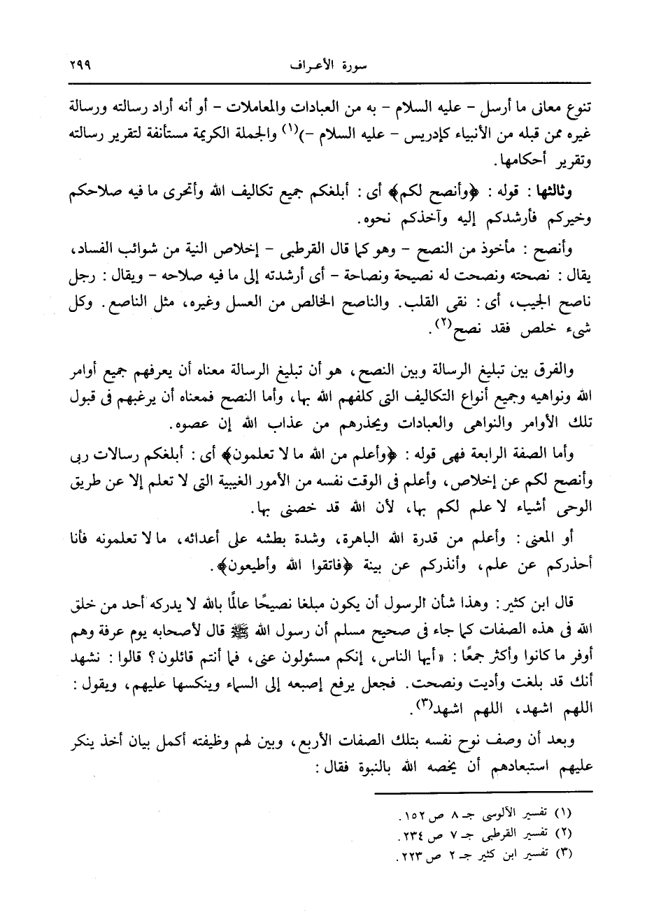 قال ابن كثير: وهذا شأن الرسول أن يكون مبلغا نصيحا عالما بالله لا يدركه أحد من خلق الله في هذه الصفات كما جاء في صحيح مسلم أن رسول الله صلى الله عليه وسلم قال لأصحابه يوم عرفة وهم أوفر ما كانوا وأكثر جمعا: «أيها الناس، إنكم مسئولون عنى، فما أنتم قائلون؟ قالوا: نشهد أنك قد بلغت وأديت ونصحت. فجعل يرفع إصبعه إلى السماء وينكسها عليهم، ويقول: