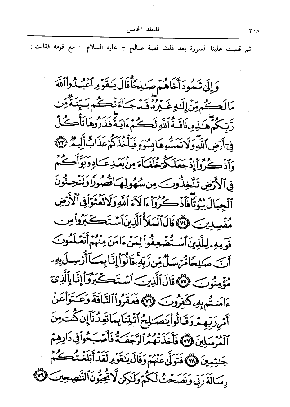 وَإِلى ثَمُودَ أَخاهُمْ صالِحاً قالَ يا قَوْمِ اعْبُدُوا اللَّهَ ما لَكُمْ مِنْ إِلهٍ غَيْرُهُ قَدْ جاءَتْكُمْ بَيِّنَةٌ مِنْ رَبِّكُمْ هذِهِ ناقَةُ اللَّهِ لَكُمْ آيَةً فَذَرُوها تَأْكُلْ فِي أَرْضِ اللَّهِ وَلا تَمَسُّوها بِسُوءٍ فَيَأْخُذَكُمْ عَذابٌ أَلِيمٌ (73) وَاذْكُرُوا إِذْ جَعَلَكُمْ خُلَفاءَ مِنْ بَعْدِ عادٍ وَبَوَّأَكُمْ فِي الْأَرْضِ تَتَّخِذُونَ مِنْ سُهُولِها قُصُوراً وَتَنْحِتُونَ الْجِبالَ بُيُوتاً فَاذْكُرُوا آلاءَ اللَّهِ وَلا تَعْثَوْا فِي الْأَرْضِ مُفْسِدِينَ (74) قالَ الْمَلَأُ الَّذِينَ اسْتَكْبَرُوا مِنْ قَوْمِهِ لِلَّذِينَ اسْتُضْعِفُوا لِمَنْ آمَنَ مِنْهُمْ أَتَعْلَمُونَ أَنَّ صالِحاً مُرْسَلٌ مِنْ رَبِّهِ قالُوا إِنَّا بِما أُرْسِلَ بِهِ مُؤْمِنُونَ (75) قالَ الَّذِينَ اسْتَكْبَرُوا إِنَّا بِالَّذِي آمَنْتُمْ بِهِ كافِرُونَ (76) فَعَقَرُوا النَّاقَةَ وَعَتَوْا عَنْ أَمْرِ رَبِّهِمْ وَقالُوا يا صالِحُ ائْتِنا بِما تَعِدُنا إِنْ كُنْتَ مِنَ الْمُرْسَلِينَ (77)