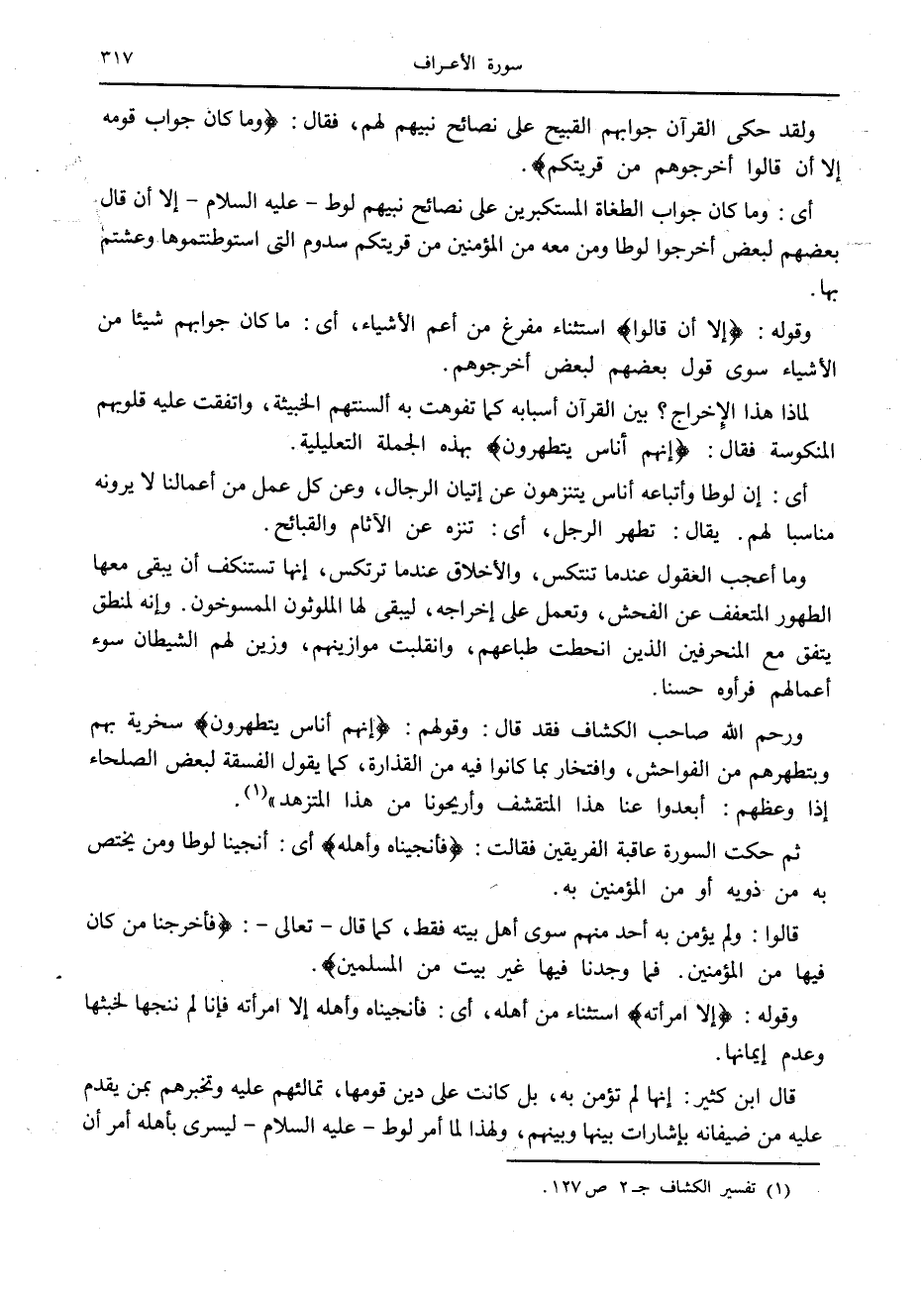 ورحم الله صاحب الكشاف فقد قال: وقولهم: إِنَّهُمْ أُناسٌ يَتَطَهَّرُونَ سخرية بهم وبتطهرهم من الفواحش، وافتخار بما كانوا فيه من القذارة، كما يقول الفسقة لبعض الصلحاء إذا وعظهم: أبعدوا عنا هذا المتقشف وأريحونا من هذا المتزهد» «1» .