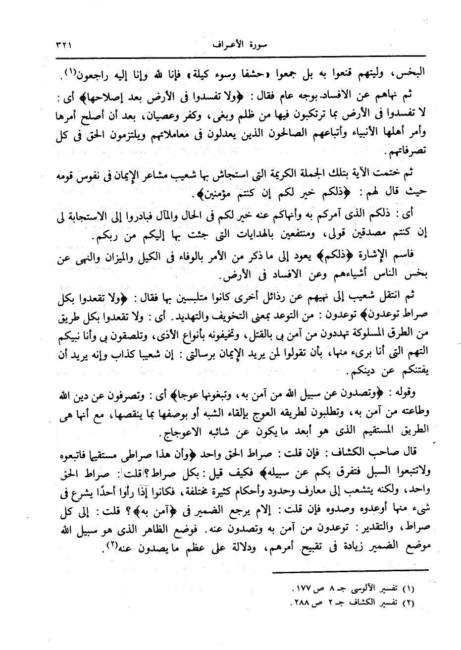 ثم انتقل شعيب إلى نهيهم عن رذائل أخرى كانوا متلبسين بها فقال: وَلا تَقْعُدُوا بِكُلِّ صِراطٍ تُوعِدُونَ توعدون: من التوعد بمعنى التخويف والتهديد. أى: ولا تقعدوا بكل طريق من الطرق المسلوكة تهددون من آمن بي بالقتل، وتخيفونه بأنواع الأذى، وتلصقون بي وأنا نبيكم التهم التي أنا برىء منها، بأن تقولوا لمن يريد الإيمان برسالتي: إن شعيبا كذاب وإنه يريد أن يفتنكم عن دينكم.