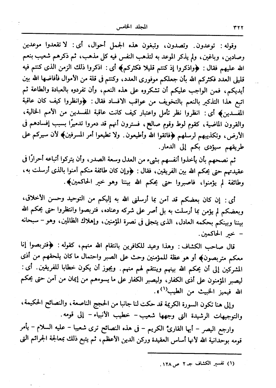 وقوله: توعدون. وتصدون، وتبغون هذه الجمل أحوال، أى: لا تقعدوا موعدين وصادين، وباغين، ولم يذكر الموعد به لتذهب النفس فيه كل مذهب، ثم ذكرهم شعيب بنعم الله عليهم فقال: وَاذْكُرُوا إِذْ كُنْتُمْ قَلِيلًا فَكَثَّرَكُمْ أى: اذكروا ذلك الزمن الذي كنتم فيه قليلي العدد فكثركم الله بأن جعلكم موفورى العدد، وكنتم في قلة من الأموال فأفاضها الله بين أيديكم، فمن الواجب عليكم أن تشكروه على هذه النعم، وأن تفردوه بالعبادة والطاعة ثم اتبع هذا التذكير بالنعم بالتخويف من عواقب الإفساد فقال: وَانْظُرُوا كَيْفَ كانَ عاقِبَةُ الْمُفْسِدِينَ أى: انظروا نظر تأمل واعتبار كيف كانت عاقبة المفسدين من الأمم الخالية، والقرون الماضية، كقوم لوط وقوم صالح، فسترون أنهم قد دمروا تدميرا بسبب إفسادهم في الأرض، وتكذيبهم لرسلهم فَاتَّقُوا اللَّهَ وَأَطِيعُونِ. وَلا تُطِيعُوا أَمْرَ الْمُسْرِفِينَ لأن سيركم على طريقهم سيؤدي بكم إلى الدمار.