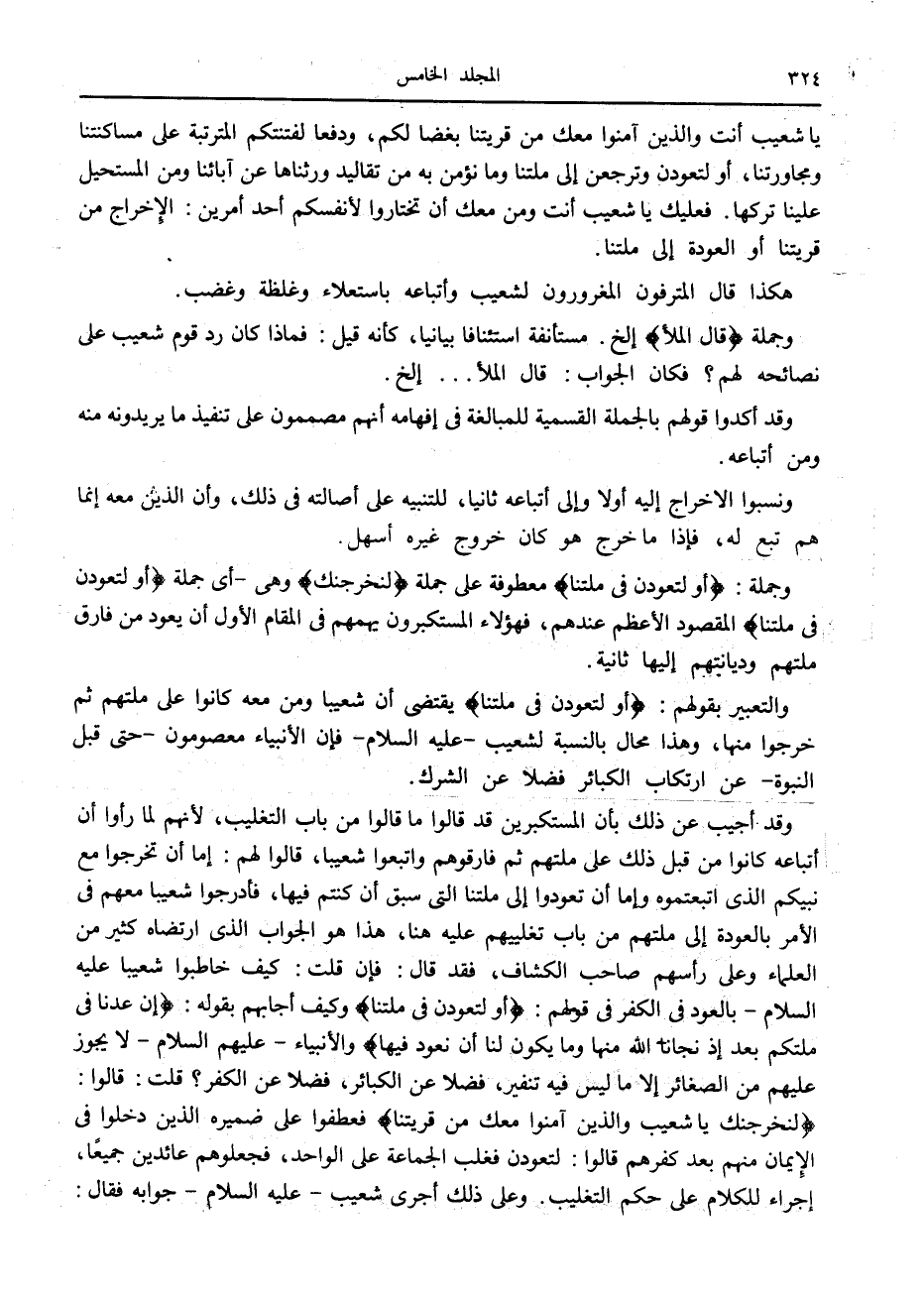 وقد أجيب عن ذلك بأن المستكبرين قد قالوا ما قالوا من باب التغليب، لأنهم لما رأوا أن أتباعه كانوا من قبل ذلك على ملتهم ثم فارقوهم واتبعوا شعيبا، قالوا لهم: إما أن تخرجوا مع نبيكم الذي اتبعتموه وإما أن تعودوا إلى ملتنا التي سبق أن كنتم فيها، فأدرجوا شعيبا معهم في الأمر بالعودة إلى ملتهم من باب تغليبهم عليه هنا، هذا هو الجواب الذي ارتضاه كثير من العلماء وعلى رأسهم صاحب الكشاف، فقد قال: فإن قلت: كيف خاطبوا شعيبا عليه السلام- بالعود في الكفر في قولهم: أَوْ لَتَعُودُنَّ فِي مِلَّتِنا وكيف أجابهم بقوله: إِنْ عُدْنا فِي مِلَّتِكُمْ بَعْدَ إِذْ نَجَّانَا اللَّهُ مِنْها وَما يَكُونُ لَنا أَنْ نَعُودَ فِيها والأنبياء- عليهم السلام- لا يجوز عليهم من الصغائر إلا ما ليس فيه تنفير، فضلا عن الكبائر، فضلا عن الكفر؟ قلت: قالوا: