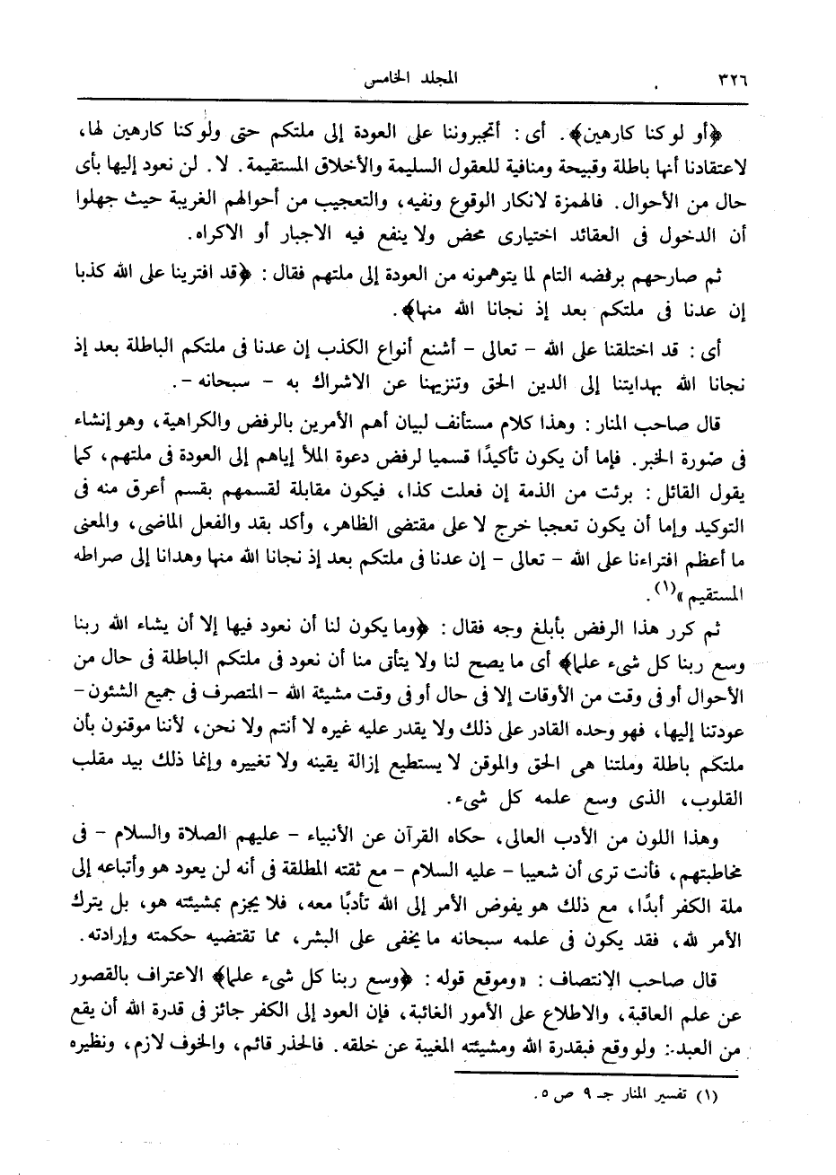 ثم كرر هذا الرفض بأبلغ وجه فقال: وَما يَكُونُ لَنا أَنْ نَعُودَ فِيها إِلَّا أَنْ يَشاءَ اللَّهُ رَبُّنا وَسِعَ رَبُّنا كُلَّ شَيْءٍ عِلْماً أى ما يصح لنا ولا يتأتى منا أن نعود في ملتكم الباطلة في حال من الأحوال أو في وقت من الأقوات إلا في حال أو في وقت مشيئة الله- المتصرف في جميع الشئون- عودتنا إليها، فهو وحده القادر على ذلك ولا يقدر عليه غيره لا أنتم ولا نحن، لأننا موقنون بأن ملتكم باطلة وملتنا هي الحق والموقن لا يستطيع إزالة يقينه ولا تغييره وإنما ذلك بيد مقلب القلوب، الذي وسع علمه كل شيء.