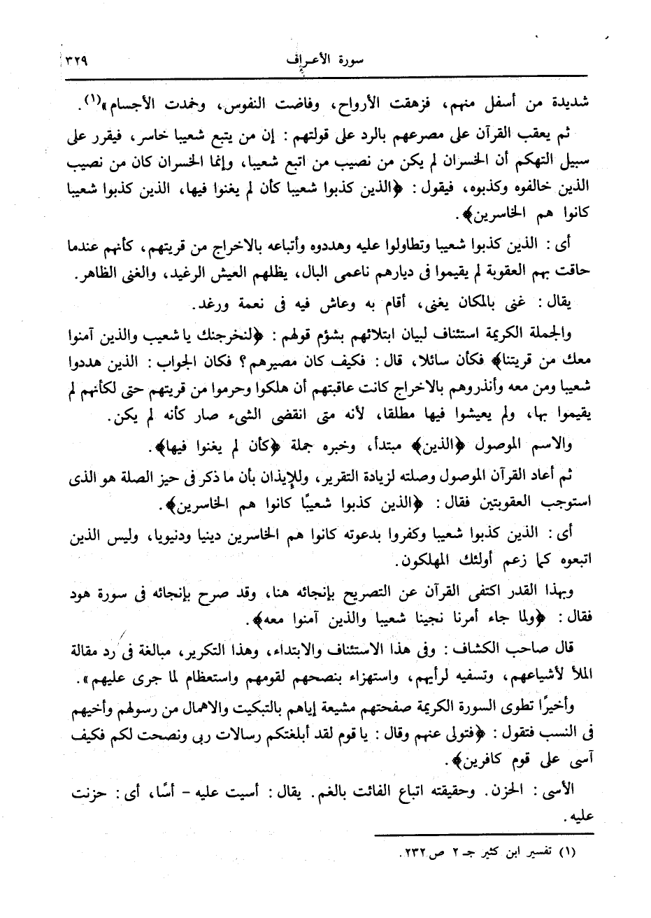 ثم يعقب القرآن على مصرعهم بالرد على قولتهم: إن من يتبع شعيبا خاسر، فيقرر على سبيل التهكم أن الخسران لم يكن من نصيب من اتبع شعيبا، وإنما الخسران كان من نصيب الذين خالفوه وكذبوه، فيقول: الَّذِينَ كَذَّبُوا شُعَيْباً كَأَنْ لَمْ يَغْنَوْا فِيهَا، الَّذِينَ كَذَّبُوا شُعَيْباً كانُوا هُمُ الْخاسِرِينَ.