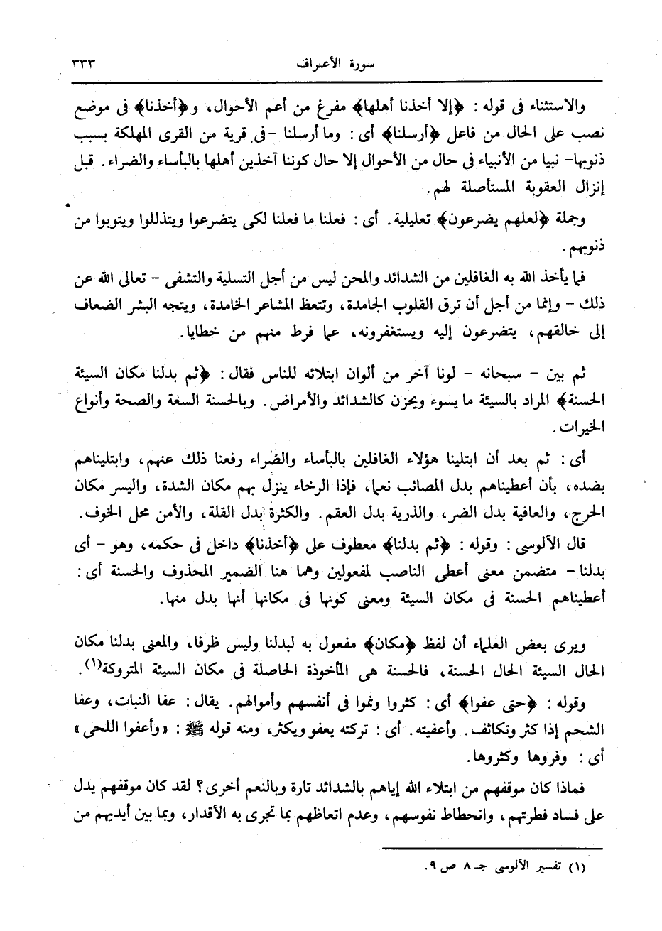 ثم بين- سبحانه- لونا آخر من ألوان ابتلائه للناس فقال: ثُمَّ بَدَّلْنا مَكانَ السَّيِّئَةِ الْحَسَنَةَ المراد بالسيئة ما يسوء ويحزن كالشدائد والأمراض. وبالحسنة السعة والصحة وأنواع الخيرات.