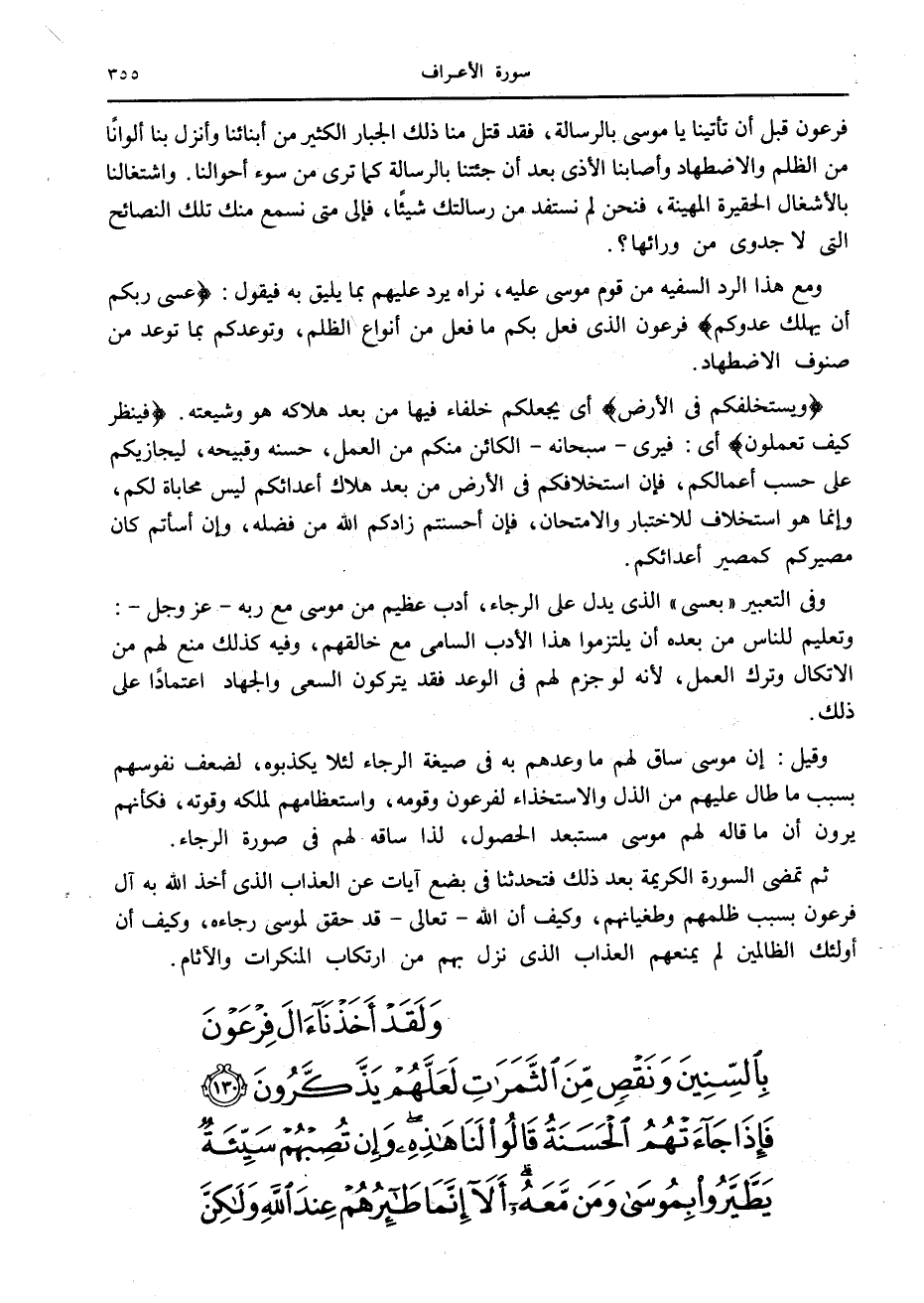 ثم تمضى السورة الكريمة بعد ذلك فتحدثنا في بضع آيات عن العذاب الذي أخذ الله به آل فرعون بسبب ظلمهم وطغيانهم، وكيف أن الله- تعالى- قد حقق لموسى رجاءه، وكيف أن أولئك الظالمين لم يمنعهم العذاب الذي نزل بهم من ارتكاب المنكرات والآثام.