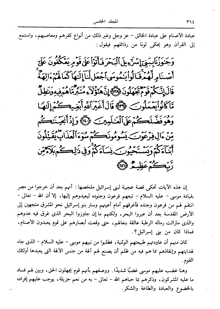 وَجاوَزْنا بِبَنِي إِسْرائِيلَ الْبَحْرَ فَأَتَوْا عَلى قَوْمٍ يَعْكُفُونَ عَلى أَصْنامٍ لَهُمْ قالُوا يا مُوسَى اجْعَلْ لَنا إِلهاً كَما لَهُمْ آلِهَةٌ قالَ إِنَّكُمْ قَوْمٌ تَجْهَلُونَ (138) إِنَّ هؤُلاءِ مُتَبَّرٌ ما هُمْ فِيهِ وَباطِلٌ ما كانُوا يَعْمَلُونَ (139) قالَ أَغَيْرَ اللَّهِ أَبْغِيكُمْ إِلهاً وَهُوَ فَضَّلَكُمْ عَلَى الْعالَمِينَ (140) وَإِذْ أَنْجَيْناكُمْ مِنْ آلِ فِرْعَوْنَ يَسُومُونَكُمْ سُوءَ الْعَذابِ يُقَتِّلُونَ أَبْناءَكُمْ وَيَسْتَحْيُونَ نِساءَكُمْ وَفِي ذلِكُمْ بَلاءٌ مِنْ رَبِّكُمْ عَظِيمٌ (141)