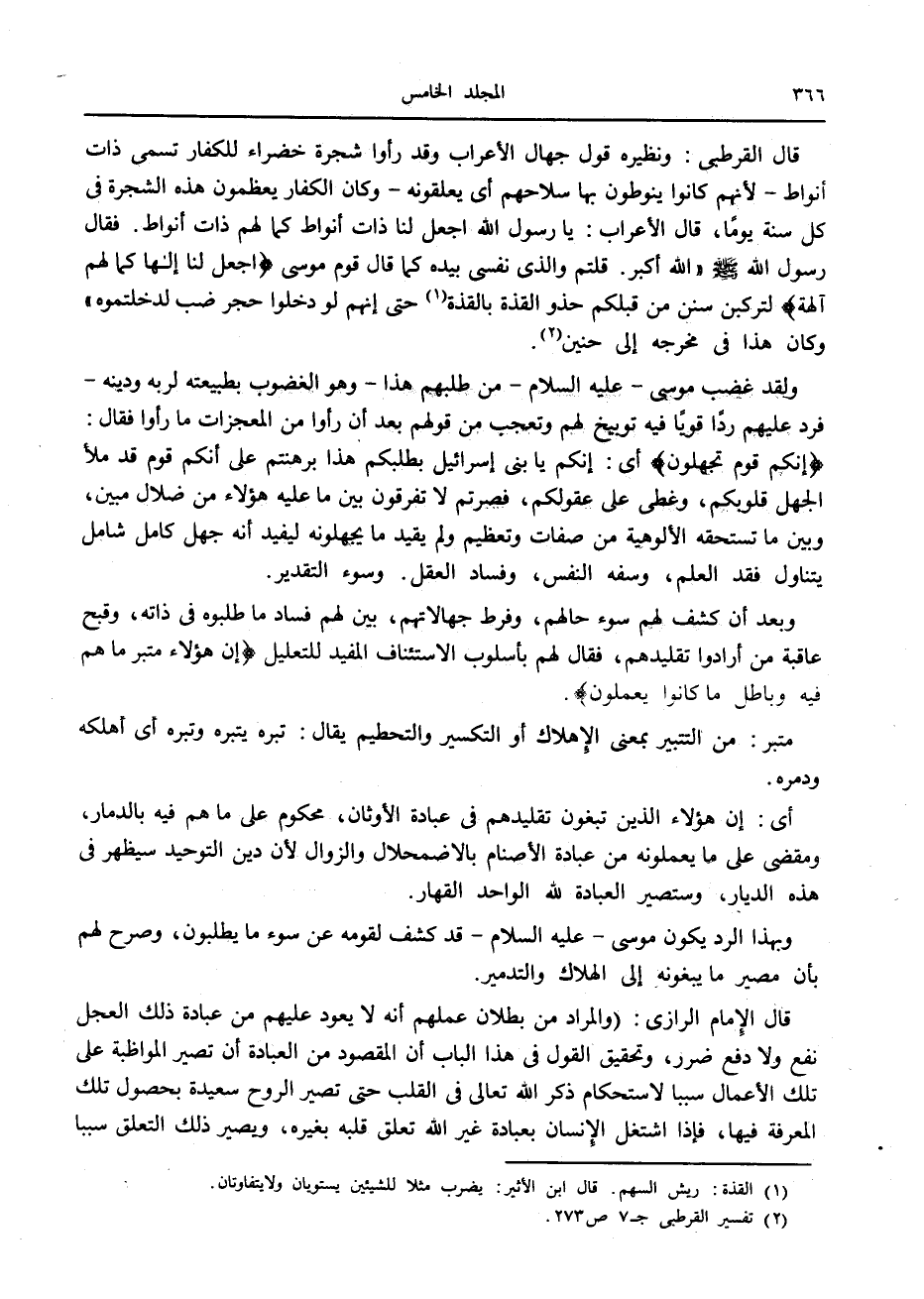 قال القرطبي: ونظيره قول جهال الأعراب وقد رأوا شجرة خضراء للكفار تسمى ذات أنواط- لأنهم كانوا ينوطون بها سلاحهم أى يعلقونه- وكان الكفار يعظمون هذه الشجرة في كل سنة يوما، قال الأعراب: يا رسول الله اجعل لنا ذات أنواط كما لهم ذات أنواط. فقال رسول الله صلّى الله عليه وسلّم «الله أكبر. قلتم والذي نفسي بيده كما قال قوم موسى اجْعَلْ لَنا إِلهاً كَما لَهُمْ آلِهَةٌ لتركبن سنن من قبلكم حذو القذة بالقذة «1» حتى إنهم لو دخلوا حجر ضب لدخلتموه» وكان هذا في مخرجه إلى حنين «2» .