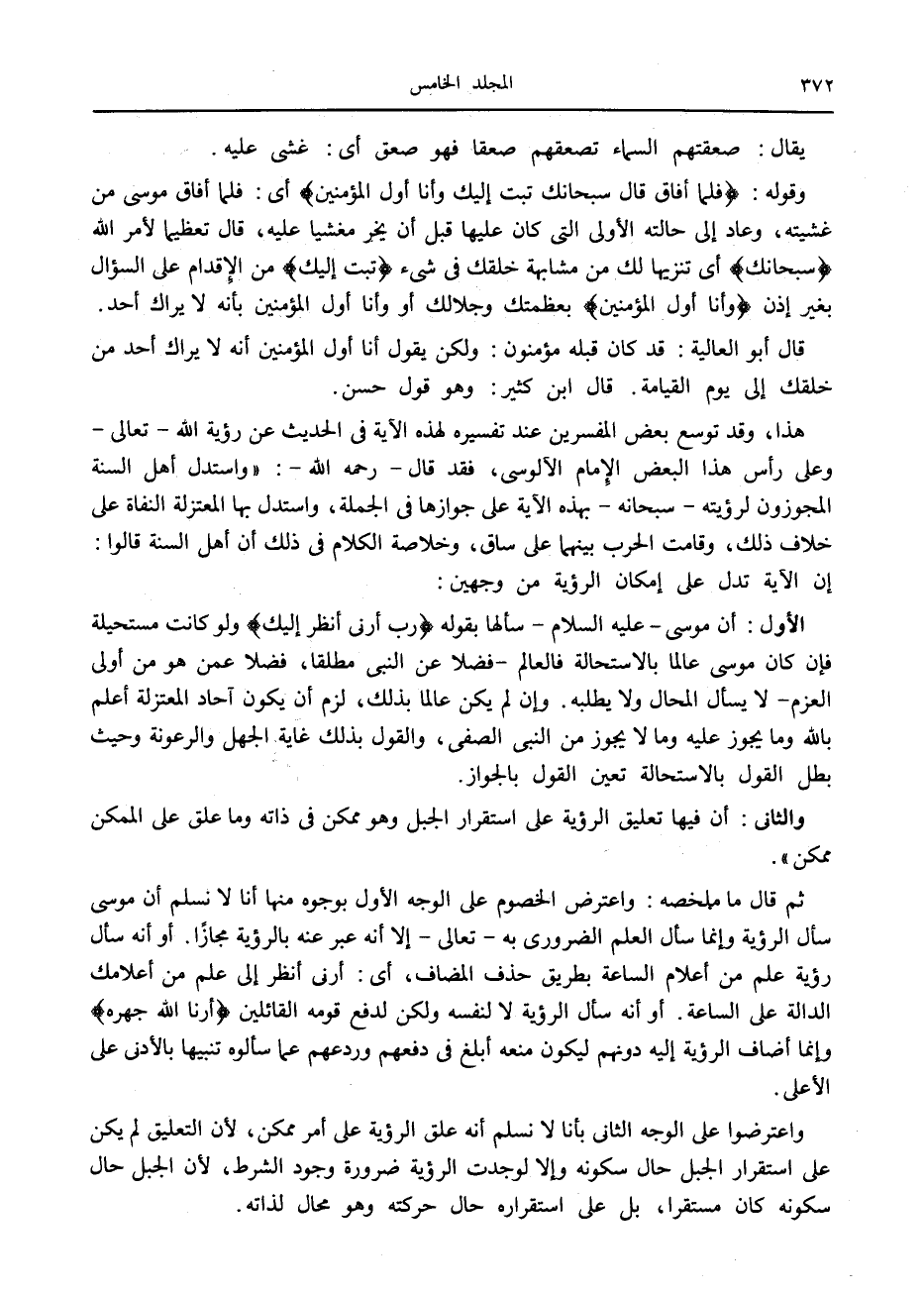 ثم قال ما ملخصه: واعترض الخصوم على الوجه الأول بوجوه منها أنا لا نسلم أن موسى سأل الرؤية وإنما سأل العلم الضروري به- تعالى- إلا أنه عبر عنه بالرؤية مجازا. أو أنه سأل رؤية علم من أعلام الساعة بطريق حذف المضاف، أى: أرنى أنظر إلى علم من أعلامك الدالة على الساعة. أو أنه سأل الرؤية لا لنفسه ولكن لدفع قومه القائلين أَرِنَا اللَّهَ جَهْرَةً وإنما أضاف الرؤية إليه دونهم ليكون منعه أبلغ في دفعهم وردعهم عما سألوه تنبيها بالأدنى على الأعلى.