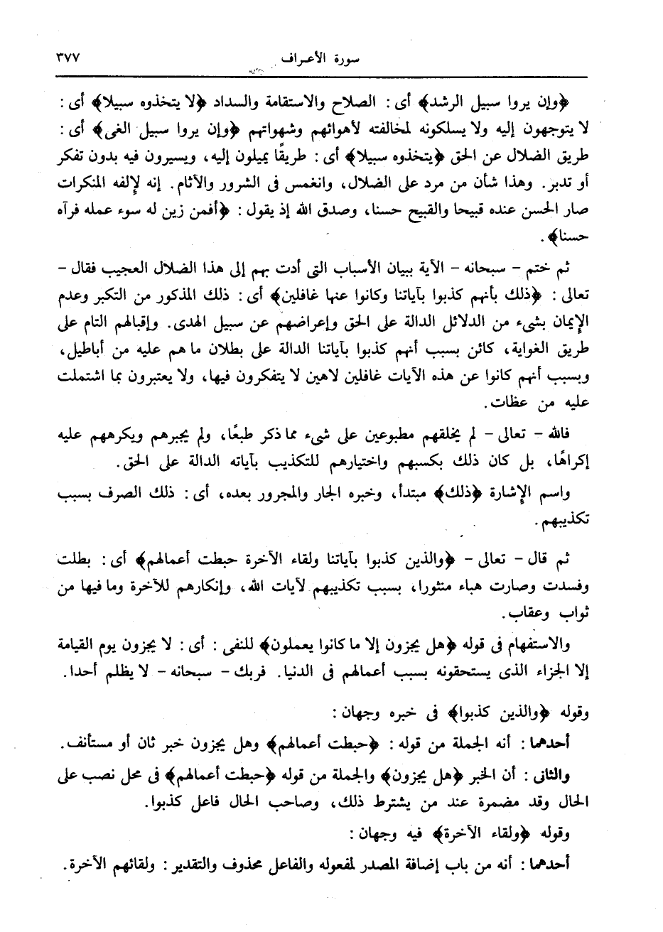 ثم ختم- سبحانه- الآية ببيان الأسباب التي أدت بهم إلى هذا الضلال العجيب فقال- تعالى: ذلِكَ بِأَنَّهُمْ كَذَّبُوا بِآياتِنا وَكانُوا عَنْها غافِلِينَ أى: ذلك المذكور من التكبر وعدم الإيمان بشيء من الدلائل الدالة على الحق وإعراضهم عن سبيل الهدى. وإقبالهم التام على طريق الغواية، كائن بسبب أنهم كذبوا بآياتنا الدالة على بطلان ما هم عليه من أباطيل، وبسبب أنهم كانوا عن هذه الآيات غافلين لاهين لا يتفكرون فيها، ولا يعتبرون بما اشتملت عليه من عظات.