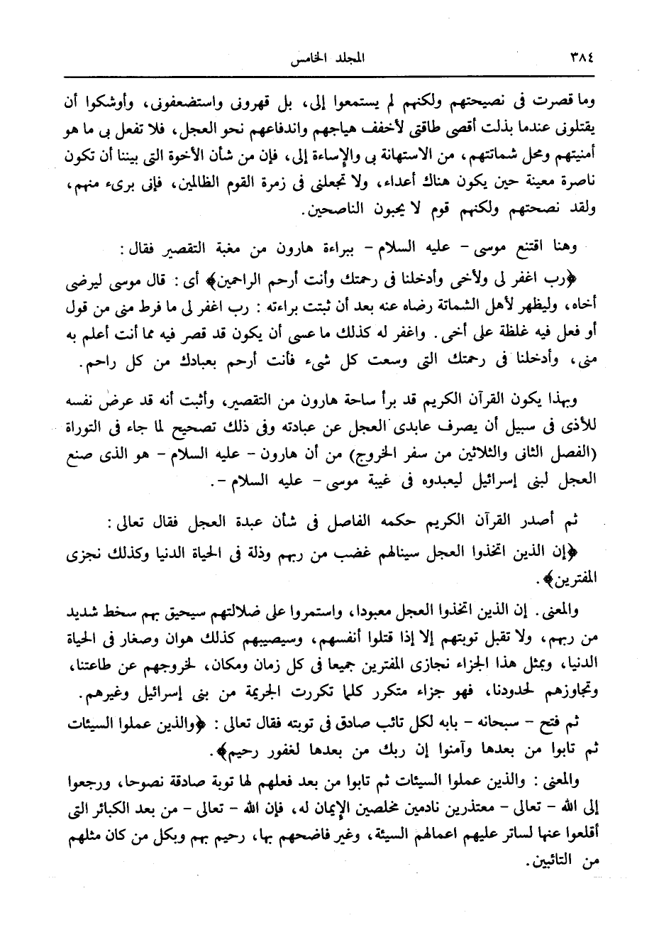وبهذا يكون القرآن الكريم قد برأ ساحة هارون من التقصير، وأثبت أنه قد عرض نفسه للأذى في سبيل أن يصرف عابدى العجل عن عبادته وفي ذلك تصحيح لما جاء في التوراة (الفصل الثاني والثلاثين من سفر الخروج) من أن هارون- عليه السلام- هو الذي صنع العجل لبنى إسرائيل ليعبدوه في غيبة موسى- عليه السلام-.