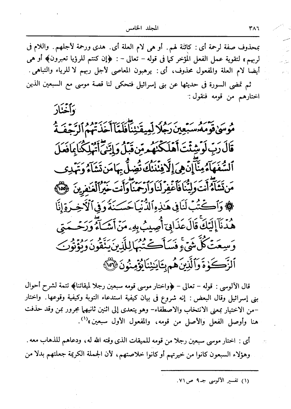 وَاخْتارَ مُوسى قَوْمَهُ سَبْعِينَ رَجُلاً لِمِيقاتِنا فَلَمَّا أَخَذَتْهُمُ الرَّجْفَةُ قالَ رَبِّ لَوْ شِئْتَ أَهْلَكْتَهُمْ مِنْ قَبْلُ وَإِيَّايَ أَتُهْلِكُنا بِما فَعَلَ السُّفَهاءُ مِنَّا إِنْ هِيَ إِلاَّ فِتْنَتُكَ تُضِلُّ بِها مَنْ تَشاءُ وَتَهْدِي مَنْ تَشاءُ أَنْتَ وَلِيُّنا فَاغْفِرْ لَنا وَارْحَمْنا وَأَنْتَ خَيْرُ الْغافِرِينَ (155) وَاكْتُبْ لَنا فِي هذِهِ الدُّنْيا حَسَنَةً وَفِي الْآخِرَةِ إِنَّا هُدْنا إِلَيْكَ قالَ عَذابِي أُصِيبُ بِهِ مَنْ أَشاءُ وَرَحْمَتِي وَسِعَتْ كُلَّ شَيْءٍ فَسَأَكْتُبُها لِلَّذِينَ يَتَّقُونَ وَيُؤْتُونَ الزَّكاةَ وَالَّذِينَ هُمْ بِآياتِنا يُؤْمِنُونَ (156)