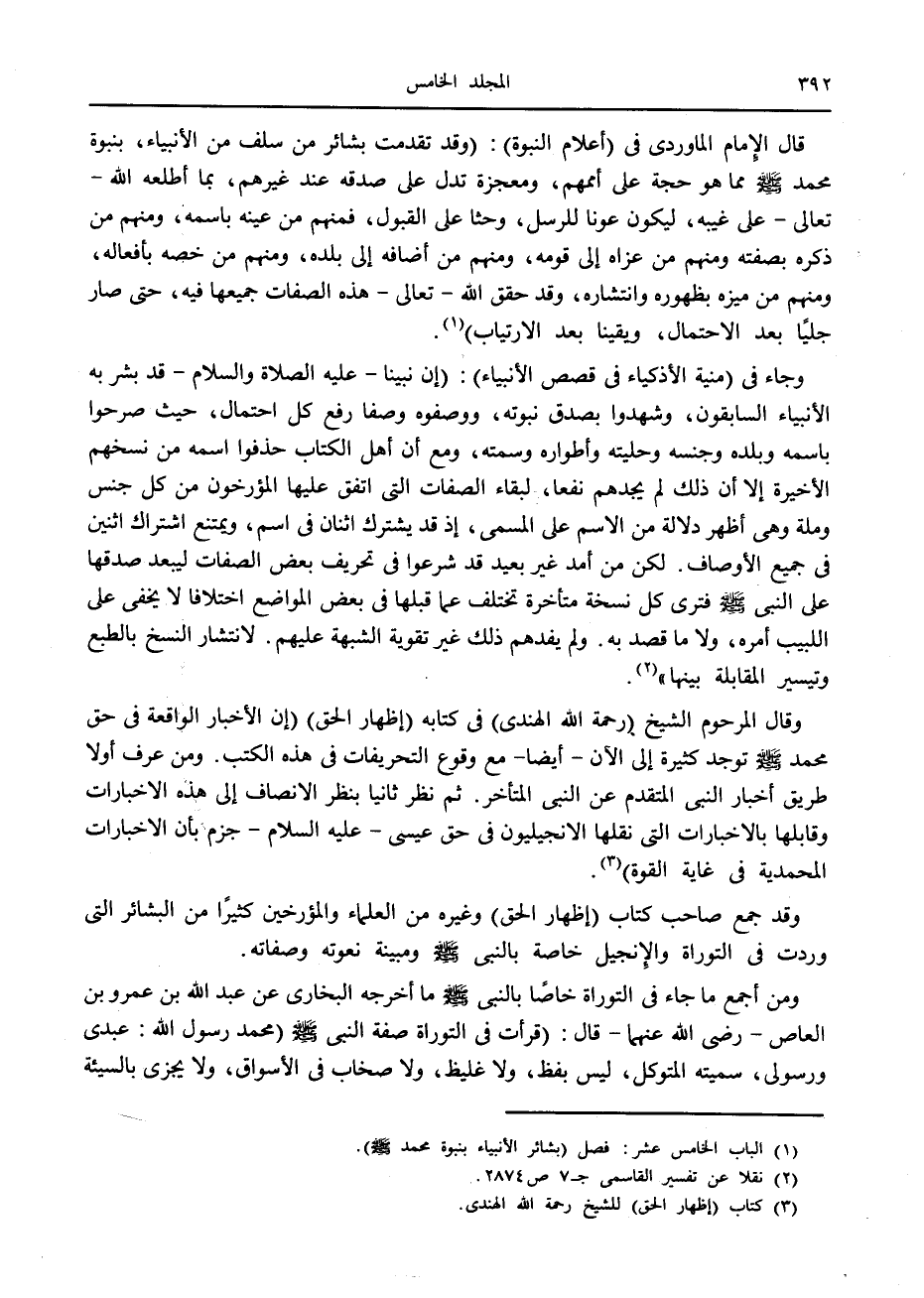 وجاء في (منية الأذكياء في قصص الأنبياء) : (إن نبينا- عليه الصلاة والسلام- قد بشر به الأنبياء السابقون، وشهدوا بصدق نبوته، ووصفوه وصفا رفع كل احتمال، حيث صرحوا باسمه وبلده وجنسه وحليته وأطواره وسمته، ومع أن أهل الكتاب حذفوا اسمه من نسخهم الأخيرة إلا أن ذلك لم يجدهم نفعا، لبقاء الصفات التي اتفق عليها المؤرخون من كل جنس وملة وهي أظهر دلالة من الاسم على المسمى، إذ قد يشترك اثنان في اسم، ويمتنع اشتراك اثنين في جميع الأوصاف. لكن من أمد غير بعيد قد شرعوا في تحريف بعض الصفات ليبعد صدقها على النبي صلّى الله عليه وسلّم فترى كل نسخة متأخرة تختلف عما قبلها في بعض المواضع اختلافا لا يخفى على اللبيب أمره، ولا ما قصد به. ولم يفدهم ذلك غير تقوية الشبهة عليهم. لانتشار النسخ بالطبع وتيسير المقابلة بينها» «2» .