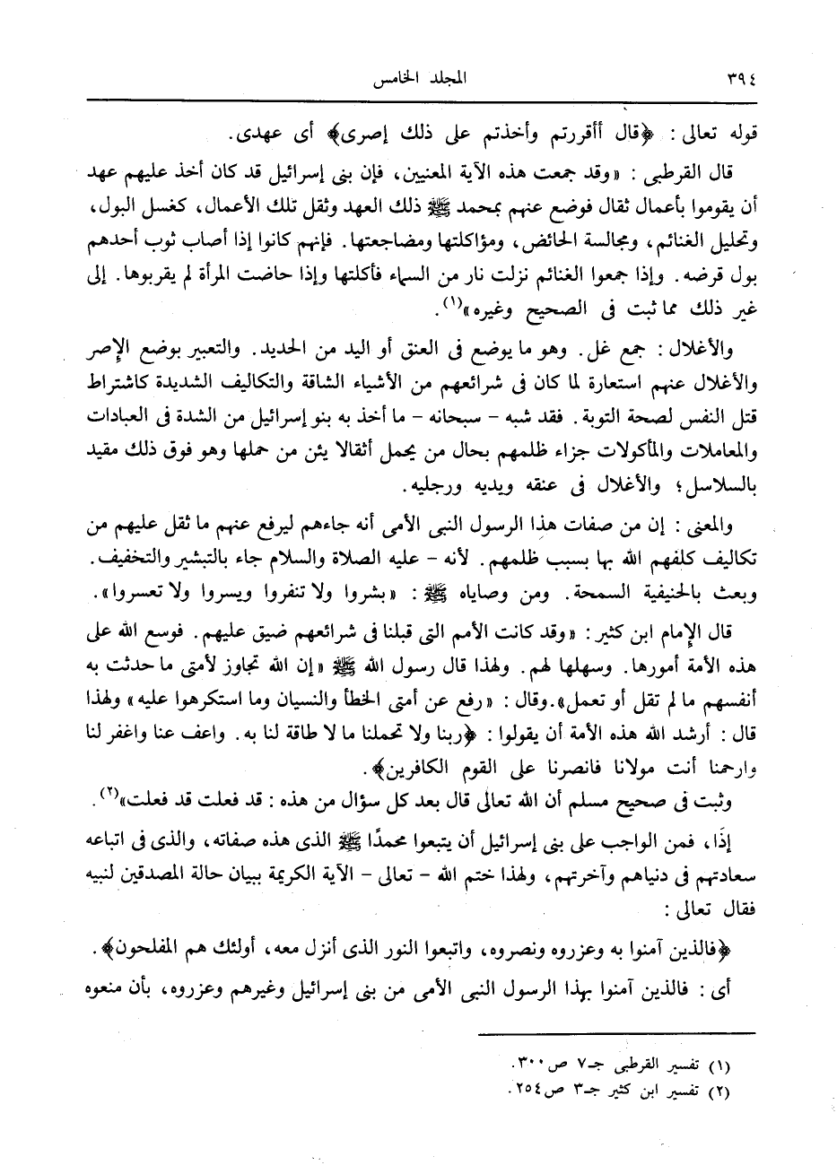 قال القرطبي: «وقد جمعت هذه الآية المعنيين، فإن بنى إسرائيل قد كان أخذ عليهم عهد أن يقوموا بأعمال ثقال فوضع عنهم بمحمد صلّى الله عليه وسلّم ذلك العهد وثقل تلك الأعمال، كغسل البول، وتحليل الغنائم، ومجالسة الحائض، ومؤاكلتها ومضاجعتها. فإنهم كانوا إذا أصاب ثوب أحدهم بول قرضه. وإذا جمعوا الغنائم نزلت نار من السماء فأكلتها وإذا حاضت المرأة لم يقربوها. إلى غير ذلك مما ثبت في الصحيح وغيره» «1» .