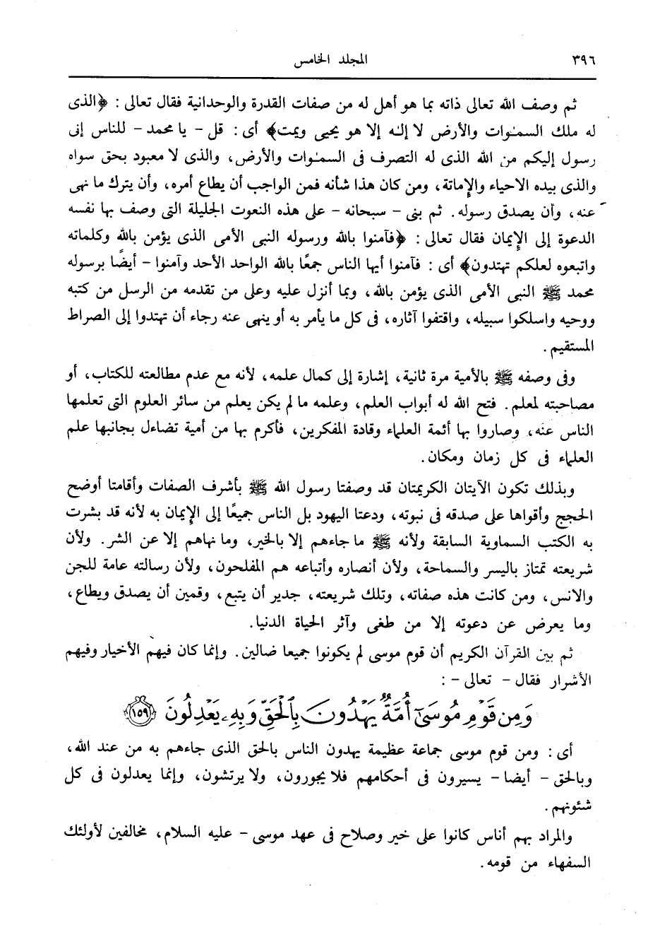 وبذلك تكون الآيتان الكريمتان قد وصفتا رسول الله صلّى الله عليه وسلّم بأشرف الصفات وأقامتا أوضح الحجج وأقواها على صدقه في نبوته، ودعتا اليهود بل الناس جميعا إلى الإيمان به لأنه قد بشرت به الكتب السماوية السابقة ولأنه صلّى الله عليه وسلّم ما جاءهم إلا بالخير، وما نهاهم إلا عن الشر. ولأن شريعته تمتاز باليسر والسماحة، ولأن أنصاره وأتباعه هم المفلحون، ولأن رسالته عامة للجن والانس، ومن كانت هذه صفاته، وتلك شريعته، جدير أن يتبع، وقمين أن يصدق ويطاع، وما يعرض عن دعوته إلا من طغى وآثر الحياة الدنيا.