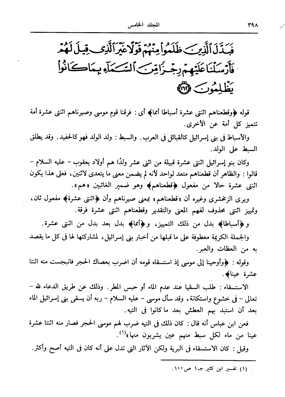 فعن ابن عباس أنه قال: كان ذلك في التيه ضرب لهم موسى الحجر فصار منه اثنتا عشرة عينا من ماء لكل سبط منهم عين يشربون منها» «1» .