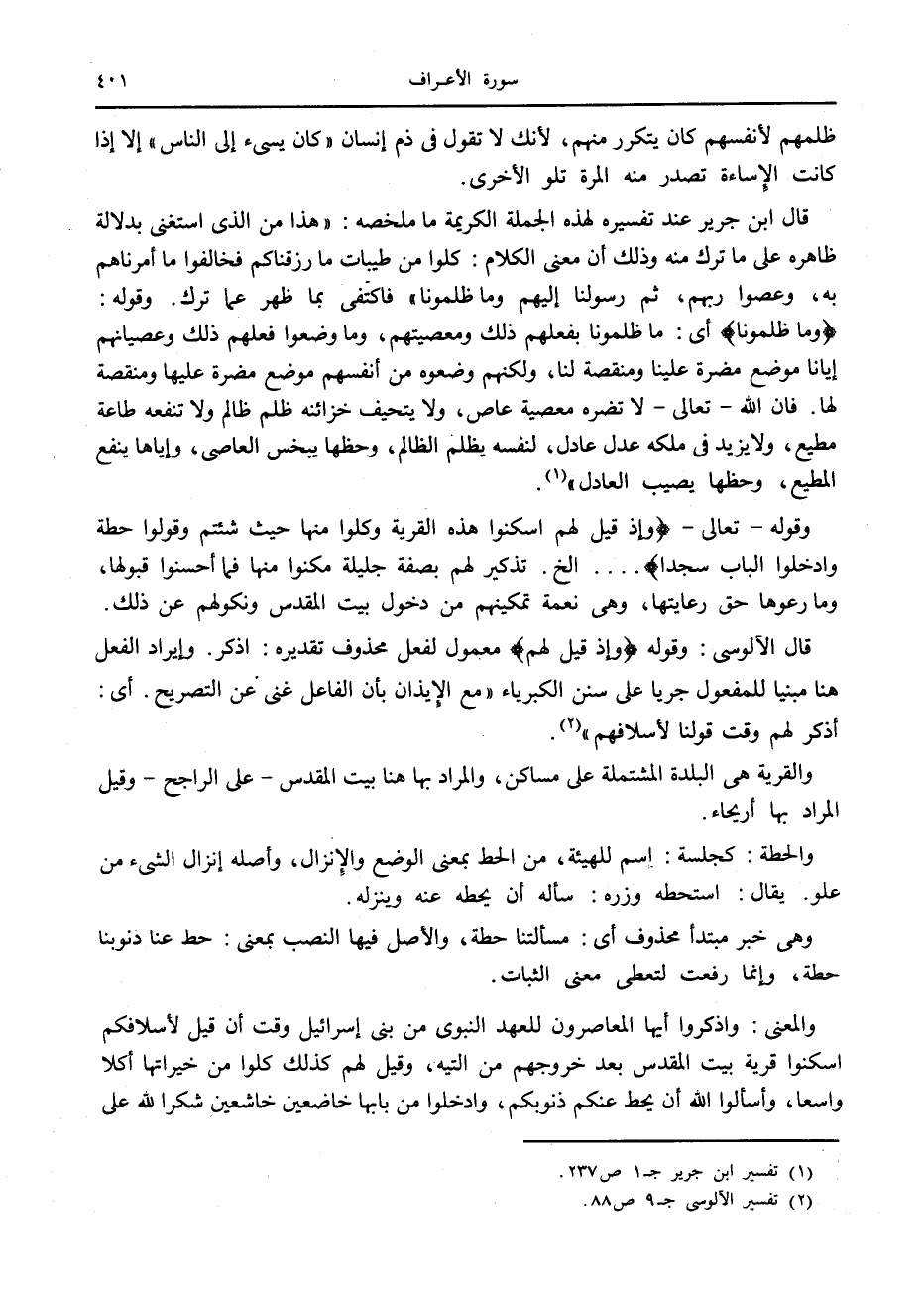 وقوله- تعالى- وَإِذْ قِيلَ لَهُمُ اسْكُنُوا هذِهِ الْقَرْيَةَ وَكُلُوا مِنْها حَيْثُ شِئْتُمْ وَقُولُوا حِطَّةٌ وَادْخُلُوا الْبابَ سُجَّداً ... إلخ. تذكير لهم بصفة جليلة مكنوا منها فما أحسنوا قبولها، وما رعوها حق رعايتها، وهي نعمة تمكينهم من دخول بيت المقدس ونكولهم عن ذلك.