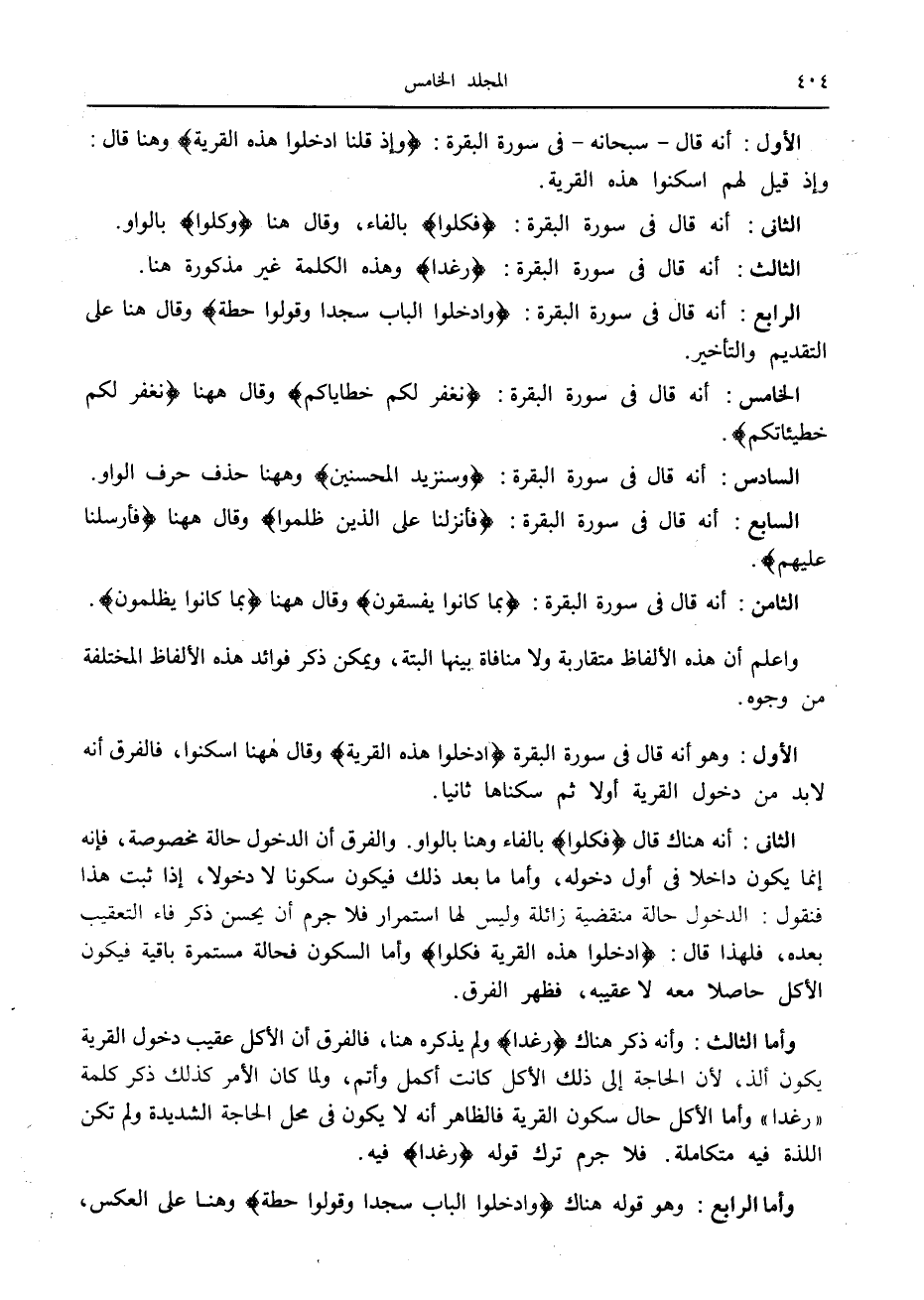 وأما الثالث: وأنه ذكر هناك رَغَداً ولم يذكره هنا، فالفرق أن الأكل عقيب دخول القرية يكون ألذ، لأن الحاجة إلى ذلك الأكل كانت أكمل وأتم، ولما كان الأمر كذلك ذكر كلمة «رغدا» وأما الأكل حال سكون القرية فالظاهر أنه لا يكون في محل الحاجة الشديدة ولم تكن اللذة فيه متكاملة. فلا جرم ترك قوله رَغَداً فيه.