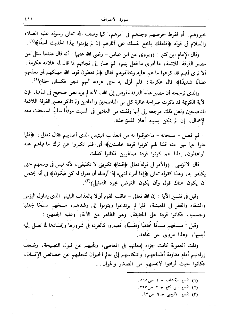 وقال الإمام ابن كثير: (ويروى عن ابن عباس- رضى الله عنهما- أنه قال عند ما سئل عن مصير الفرقة اللائمة، ما أدرى ما فعل بهم، ثم صار إلى نجاتهم لما قال له غلامه عكرمة: