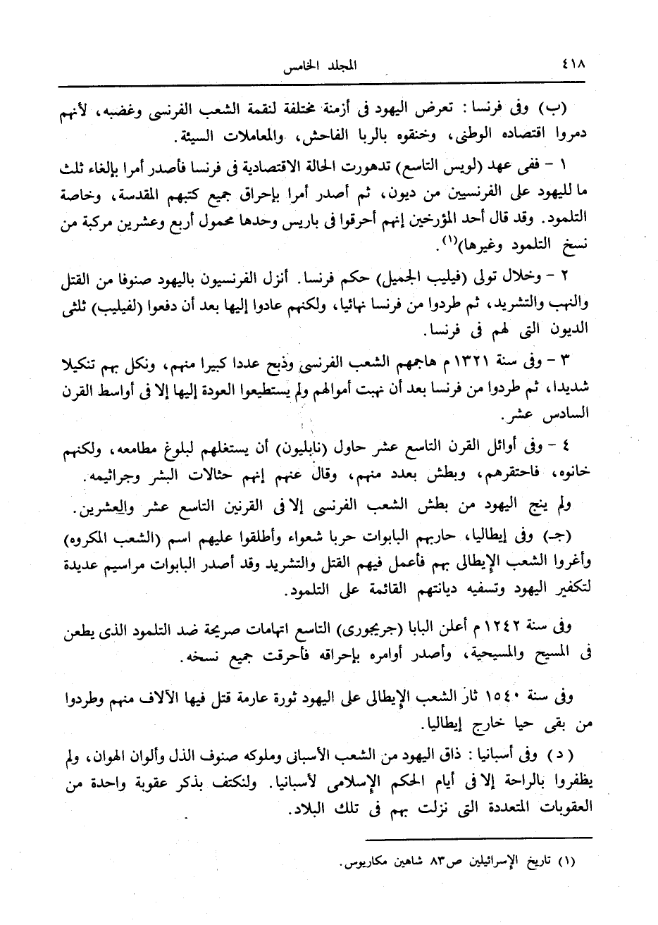 1- ففي عهد (لويس التاسع) تدهورت الحالة الاقتصادية في فرنسا فأصدر أمرا بإلغاء ثلث ما لليهود على الفرنسيين من ديون، ثم أصدر أمرا بإحراق جميع كتبهم المقدسة، وخاصة التلمود. وقد قال أحد المؤرخين إنهم أحرقوا في باريس وحدها محمول أربع وعشرين مركبة من نسخ التلمود وغيرها) «1» .