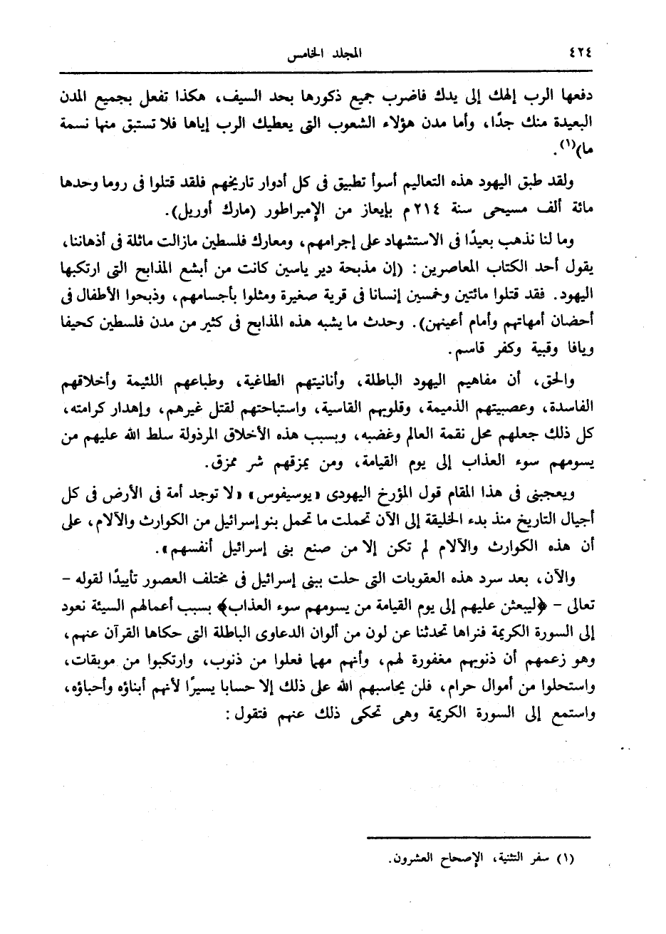 ويعجبني في هذا المقام قول المؤرخ اليهودي «يوسيفوس» «لا توجد أمة في الأرض في كل أجيال التاريخ منذ بدء الخليقة إلى الآن تحملت ما تحمل بنو إسرائيل من الكوارث والآلام، على أن هذه الكوارث والآلام لم تكن إلا من صنع بنى إسرائيل أنفسهم» .