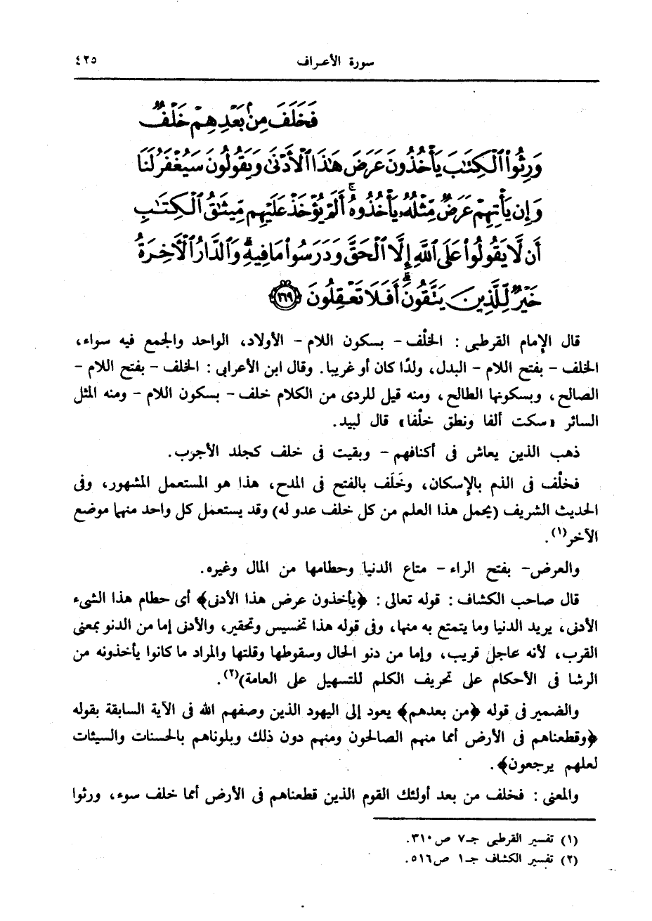 فَخَلَفَ مِنْ بَعْدِهِمْ خَلْفٌ وَرِثُوا الْكِتابَ يَأْخُذُونَ عَرَضَ هذَا الْأَدْنى وَيَقُولُونَ سَيُغْفَرُ لَنا وَإِنْ يَأْتِهِمْ عَرَضٌ مِثْلُهُ يَأْخُذُوهُ أَلَمْ يُؤْخَذْ عَلَيْهِمْ مِيثاقُ الْكِتابِ أَنْ لا يَقُولُوا عَلَى اللَّهِ إِلاَّ الْحَقَّ وَدَرَسُوا ما فِيهِ وَالدَّارُ الْآخِرَةُ خَيْرٌ لِلَّذِينَ يَتَّقُونَ أَفَلا تَعْقِلُونَ (169) وَالَّذِينَ يُمَسِّكُونَ بِالْكِتابِ وَأَقامُوا الصَّلاةَ إِنَّا لا نُضِيعُ أَجْرَ الْمُصْلِحِينَ (170)