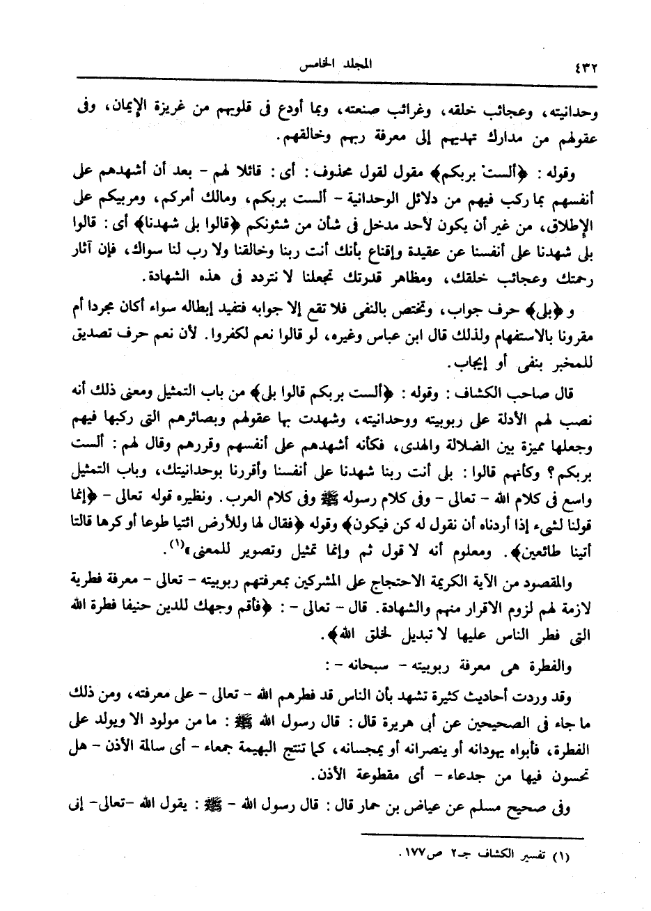 قال صاحب الكشاف: وقوله: أَلَسْتُ بِرَبِّكُمْ قالُوا بَلى من باب التمثيل ومعنى ذلك أنه نصب لهم الأدلة على ربوبيته ووحدانيته، وشهدت بها عقولهم وبصائرهم التي ركبها فيهم وجعلها مميزة بين الضلالة والهدى، فكأنه أشهدهم على أنفسهم وقررهم وقال لهم: ألست بربكم؟ وكأنهم قالوا: بلى أنت ربنا شهدنا على أنفسنا وأقررنا بوحدانيتك، وباب التمثيل واسع في كلام الله- تعالى- وفي كلام رسوله صلّى الله عليه وسلّم وفي كلام العرب. ونظيره قوله تعالى- إِنَّما قَوْلُنا لِشَيْءٍ إِذا أَرَدْناهُ أَنْ نَقُولَ لَهُ كُنْ فَيَكُونُ وقوله فَقالَ لَها وَلِلْأَرْضِ ائْتِيا طَوْعاً أَوْ كَرْهاً قالَتا أَتَيْنا طائِعِينَ. ومعلوم أنه لا قول ثم وإنما تمثيل وتصوير للمعنى» «1» .