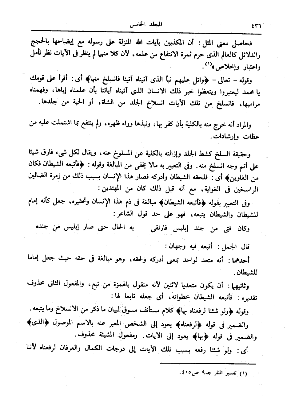 وقوله- تعالى- وَاتْلُ عَلَيْهِمْ نَبَأَ الَّذِي آتَيْناهُ آياتِنا فَانْسَلَخَ مِنْها أى: اقرأ على قومك يا محمد ليعتبروا ويتعظوا خبر ذلك الإنسان الذي آتيناه آياتنا بأن علمناه إياه، وفهمناه مراميها، فانسلخ من تلك الآيات انسلاخ الجلد من الشاة، أو الحية من جلدها.