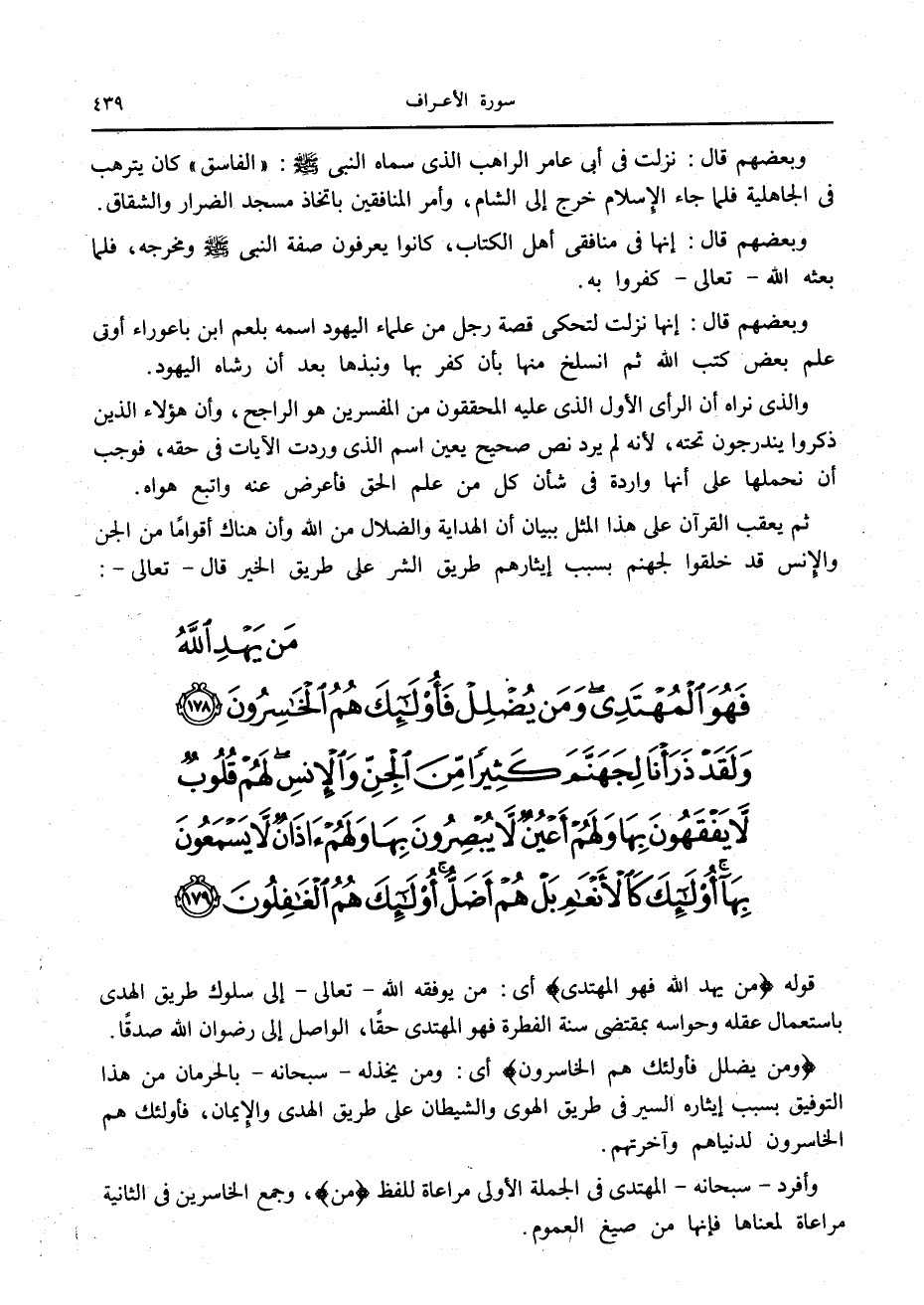 مَنْ يَهْدِ اللَّهُ فَهُوَ الْمُهْتَدِي وَمَنْ يُضْلِلْ فَأُولئِكَ هُمُ الْخاسِرُونَ (178) وَلَقَدْ ذَرَأْنا لِجَهَنَّمَ كَثِيراً مِنَ الْجِنِّ وَالْإِنْسِ لَهُمْ قُلُوبٌ لا يَفْقَهُونَ بِها وَلَهُمْ أَعْيُنٌ لا يُبْصِرُونَ بِها وَلَهُمْ آذانٌ لا يَسْمَعُونَ بِها أُولئِكَ كَالْأَنْعامِ بَلْ هُمْ أَضَلُّ أُولئِكَ هُمُ الْغافِلُونَ (179)