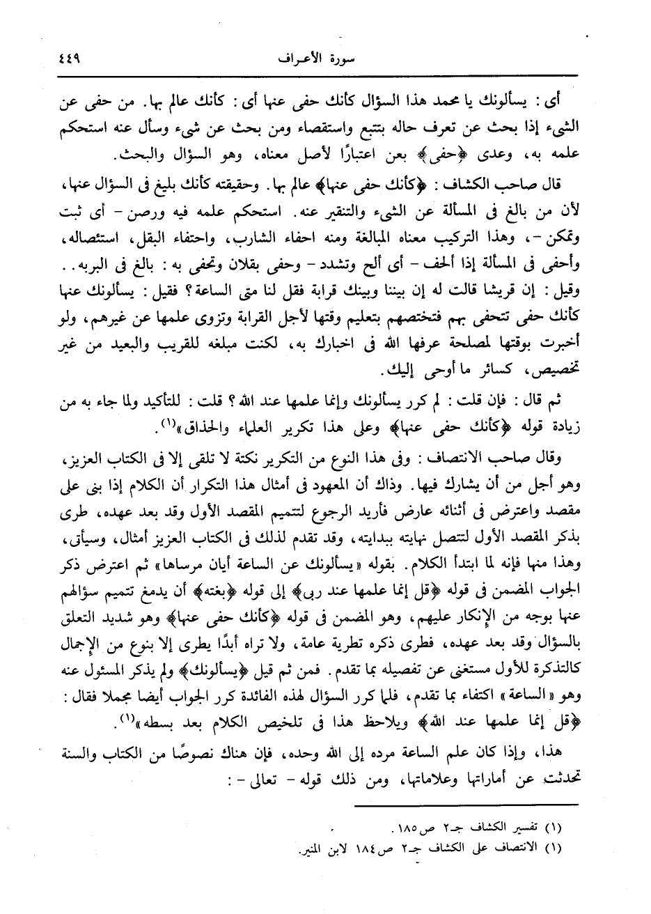 وقال صاحب الانتصاف: وفي هذا النوع من التكرير نكتة لا تلقى إلا في الكتاب العزيز، وهو أجل من أن يشارك فيها. وذاك أن المعهود في أمثال هذا التكرار أن الكلام إذا بنى على مقصد واعترض في أثنائه عارض فأريد الرجوع لتتميم المقصد الأول وقد بعد عهده، طرى بذكر المقصد الأول لتتصل نهايته ببدايته، وقد تقدم لذلك في الكتاب العزيز أمثال، وسيأتى، وهذا منها فإنه لما ابتدأ الكلام. بقوله «يسألونك عن الساعة أيان مرساها» ثم اعترض ذكر الجواب المضمن في قوله قُلْ إِنَّما عِلْمُها عِنْدَ رَبِّي إلى قوله بَغْتَةً أن يدمغ تتميم سؤالهم عنها بوجه من الإنكار عليهم، وهو المضمن في قوله كَأَنَّكَ حَفِيٌّ عَنْها وهو شديد التعلق بالسؤال وقد بعد عهده، فطري ذكره تطرية عامة، ولا تراه أبدا يطري إلا بنوع من الإجمال كالتذكرة للأول مستغنى عن تفصيله بما تقدم. فمن ثم قيل يَسْئَلُونَكَ ولم يذكر المسئول عنه وهو «الساعة» اكتفاء بما تقدم، فلما كرر السؤال لهذه الفائدة كرر الجواب أيضا مجملا فقال: