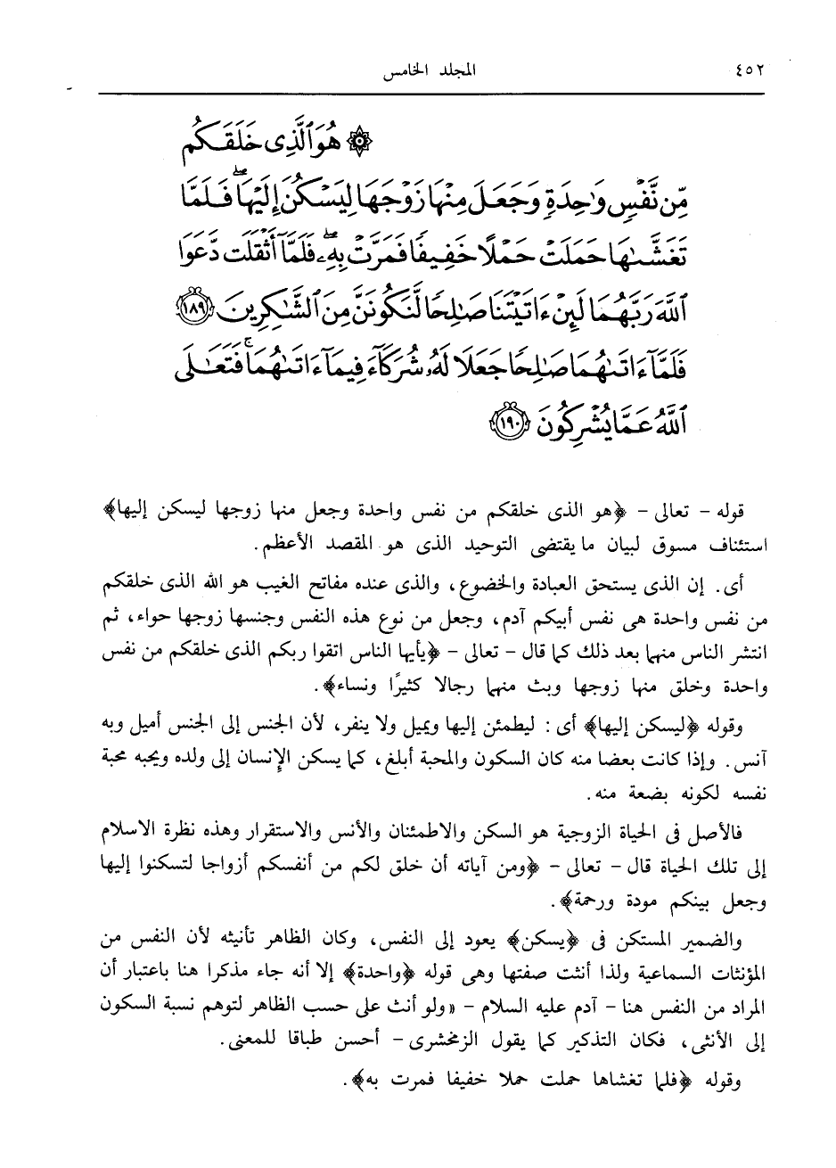 هُوَ الَّذِي خَلَقَكُمْ مِنْ نَفْسٍ واحِدَةٍ وَجَعَلَ مِنْها زَوْجَها لِيَسْكُنَ إِلَيْها فَلَمَّا تَغَشَّاها حَمَلَتْ حَمْلاً خَفِيفاً فَمَرَّتْ بِهِ فَلَمَّا أَثْقَلَتْ دَعَوَا اللَّهَ رَبَّهُما لَئِنْ آتَيْتَنا صالِحاً لَنَكُونَنَّ مِنَ الشَّاكِرِينَ (189) فَلَمَّا آتاهُما صالِحاً جَعَلا لَهُ شُرَكاءَ فِيما آتاهُما فَتَعالَى اللَّهُ عَمَّا يُشْرِكُونَ (190)