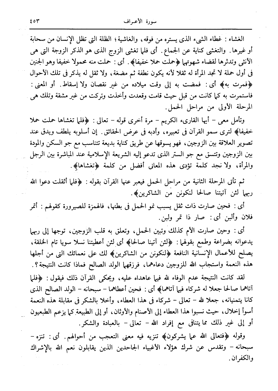 وتأمل معى- أيها القارئ الكريم- مرة أخرى قوله- تعالى: فَلَمَّا تَغَشَّاها حَمَلَتْ حَمْلًا خَفِيفاً لترى سمو القرآن في تعبيره، وأدبه في عرض الحقائق. إن أسلوبه يلطف ويدق عند تصوير العلاقة بين الزوجين، فهو يسوقها عن طريق كناية بديعة تتناسب مع جو السكن والمودة بين الزوجين وتتسق مع جو الستر الذي تدعو إليه الشريعة الإسلامية عند المباشرة بين الرجل والمرأة، ولا نجد كلمة تؤدى هذه المعاني أفضل من كلمة تَغَشَّاها.