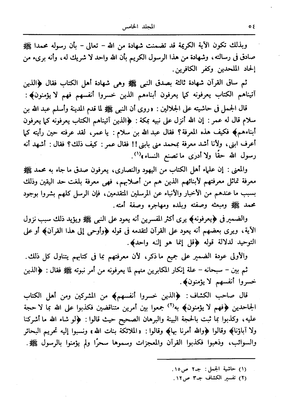 ثم ساق القرآن شهادة ثالثة بصدق النبي صلى الله عليه وسلم وهي شهادة أهل الكتاب فقال الَّذِينَ آتَيْناهُمُ الْكِتابَ يَعْرِفُونَهُ كَما يَعْرِفُونَ أَبْناءَهُمُ الَّذِينَ خَسِرُوا أَنْفُسَهُمْ فَهُمْ لا يُؤْمِنُونَ:
