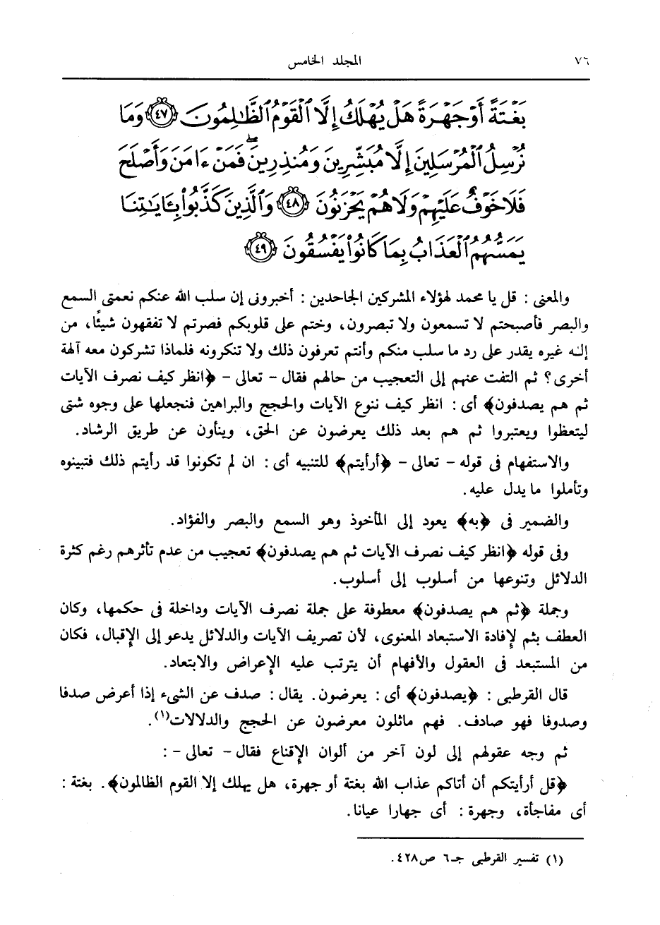 قُلْ أَرَأَيْتَكُمْ إِنْ أَتاكُمْ عَذابُ اللَّهِ بَغْتَةً أَوْ جَهْرَةً، هَلْ يُهْلَكُ إِلَّا الْقَوْمُ الظَّالِمُونَ. بغتة: