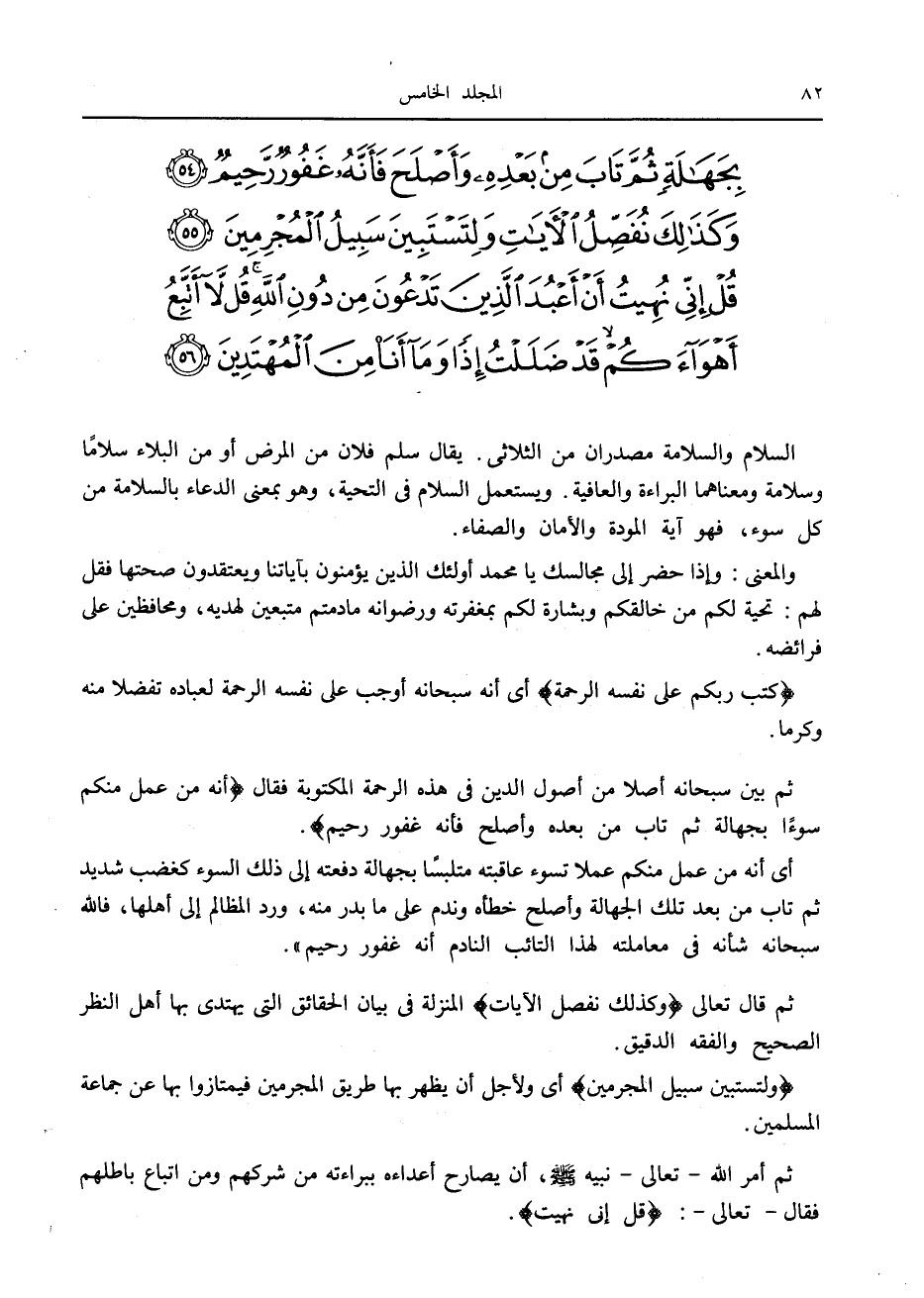 وَإِذا جاءَكَ الَّذِينَ يُؤْمِنُونَ بِآياتِنا فَقُلْ سَلامٌ عَلَيْكُمْ كَتَبَ رَبُّكُمْ عَلى نَفْسِهِ الرَّحْمَةَ أَنَّهُ مَنْ عَمِلَ مِنْكُمْ سُوءاً بِجَهالَةٍ ثُمَّ تابَ مِنْ بَعْدِهِ وَأَصْلَحَ فَأَنَّهُ غَفُورٌ رَحِيمٌ (54) وَكَذلِكَ نُفَصِّلُ الْآياتِ وَلِتَسْتَبِينَ سَبِيلُ الْمُجْرِمِينَ (55) قُلْ إِنِّي نُهِيتُ أَنْ أَعْبُدَ الَّذِينَ تَدْعُونَ مِنْ دُونِ اللَّهِ قُلْ لا أَتَّبِعُ أَهْواءَكُمْ قَدْ ضَلَلْتُ إِذاً وَما أَنَا مِنَ الْمُهْتَدِينَ (56)