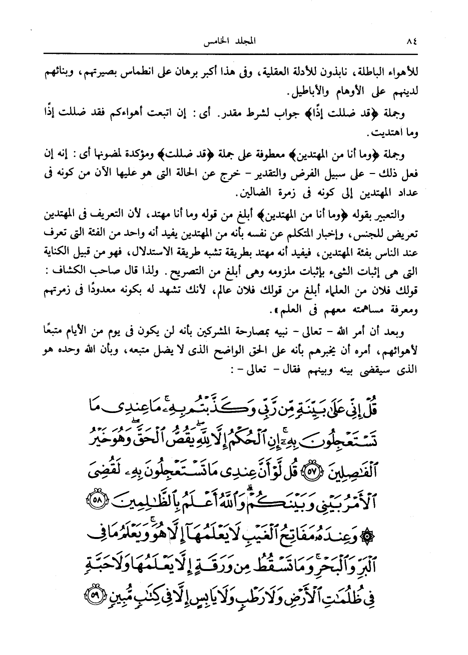 وبعد أن أمر الله- تعالى- نبيه بمصارحة المشركين بأنه لن يكون في يوم من الأيام متبعا لأهوائهم، أمره أن يخبرهم بأنه على الحق الواضح الذي لا يضل متبعه، وبأن الله وحده هو الذي سيقضي بينه وبينهم فقال- تعالى-: